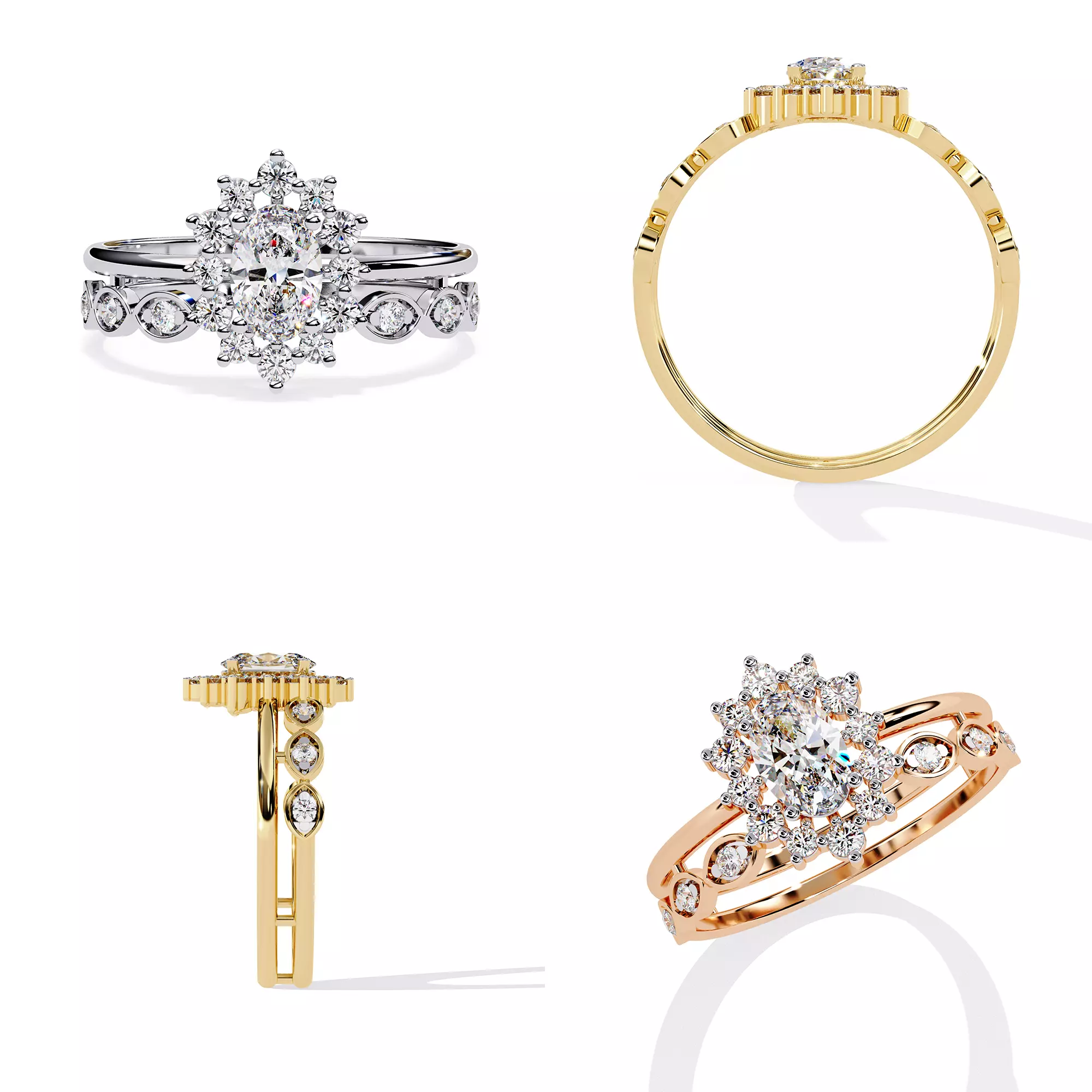 Round center stone in floral halo Marquise + round diamond accents Split shank with bezel-set side stones Gold / Platinum / Silver compatible No mesh errors / clean production geometry Real gemstone fitting supported