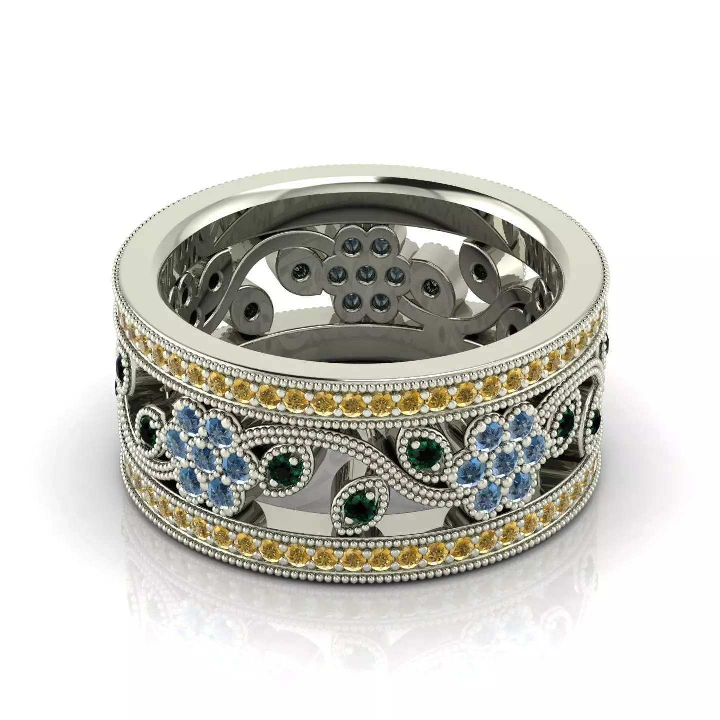 Flower pattern Eternity Band or Cocktail Ring with two side rows of round stones in pave shared prongs settings, and a middle flower pattern milgrain and round stone band.