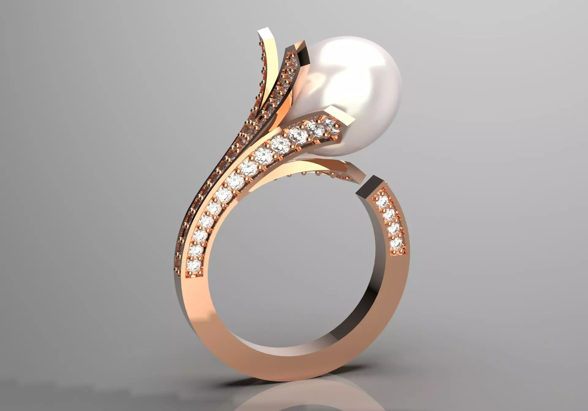 This ring showcases a stunning design that beautifully combines elegance and contemporary aesthetics. The arm is crafted from rose gold, which offers a warm and romantic color that enhances the ring’s luxurious feel.The prominent, shiny pearl sits at the center, adding a classic feel. Its smooth surface contrasts nicely with the angular design of the arm.The ring is encrusted with small, sparkling diamonds that capture the light and create a sparkling effect, adding glamour to the piece.The ring has a flowing, twisted shape that beautifully wraps around the pearl, showing movement and fluidity. This design element gives it a modern twist while maintaining a timeless beauty.The combination of pearls, sparkling diamonds, and rose gold creates a visually striking piece that is perfect for special occasions or as an accessory.