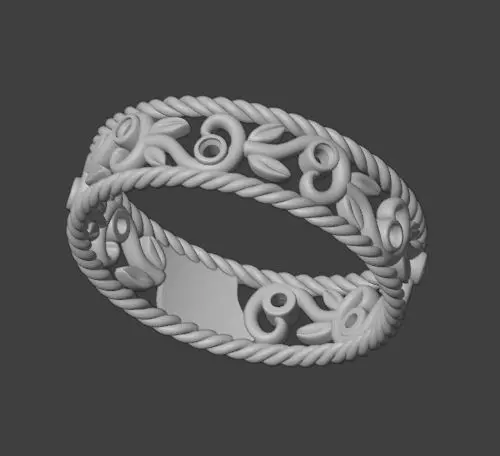 The ring in the image is a digital 3D model intended for jewelry manufacturing via 3D printing or CNC machines. This particular design features floral patterns framed by two rows of twisted rope.