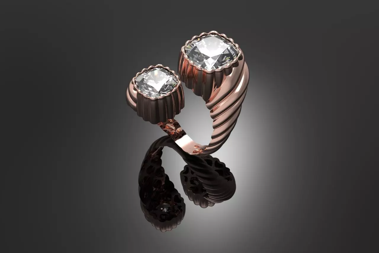 Product Overview: A sophisticated Toi et Moi style bypass ring featuring two brilliant square-cut gemstones. The design stands out with its elegant fluted/ribbed bezel settings and a dynamic spiral-textured shank. For professional manufacturing, the inner shank is engineered with a honeycomb pattern to optimize metal weight while maintaining structural integrity.