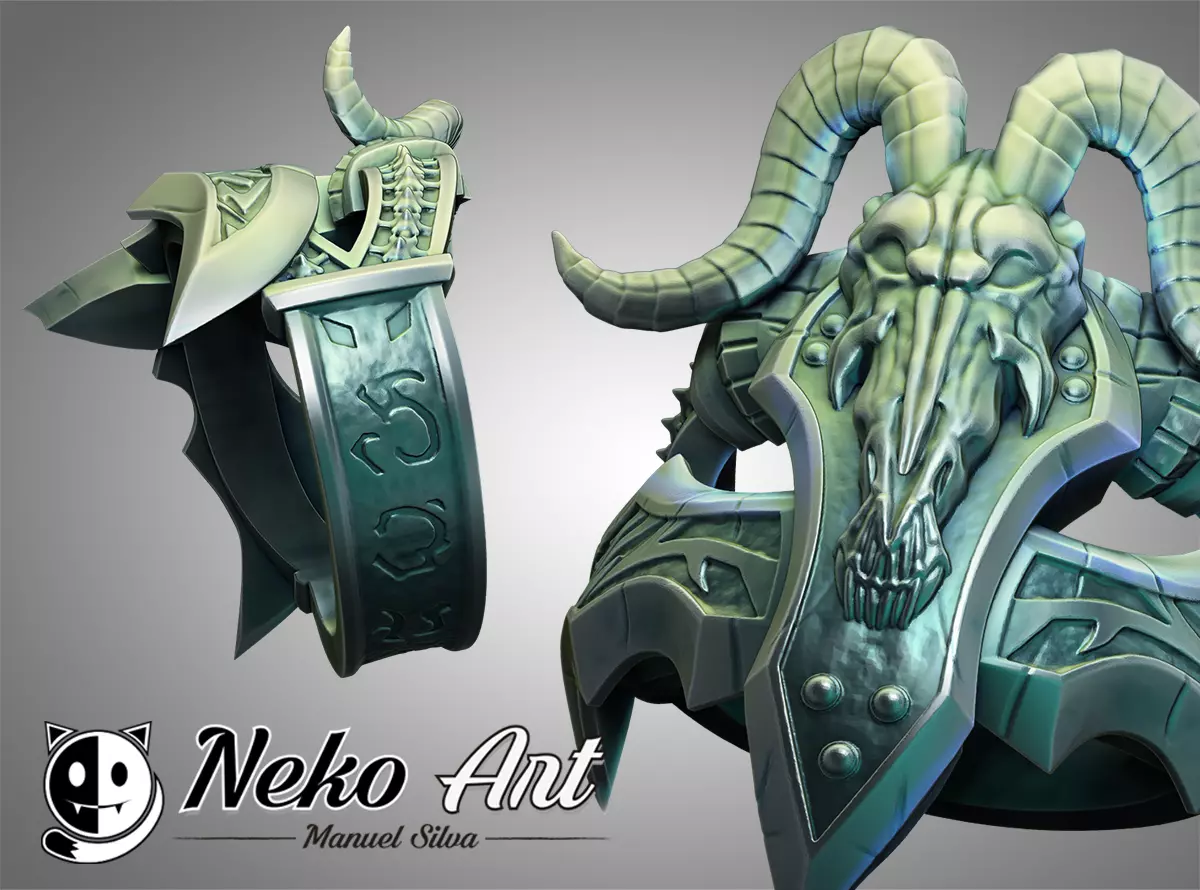 Ring inspired by frostmourne, from the game warcraft, for a jewelry contest in cults3d, remaining as an honorable mention. This ring has details of bones and the famous skull of the licht, also preserving the two lower blades. In the lower part of the ring some runes related to the game were engraved, for personal, non-commercial printing