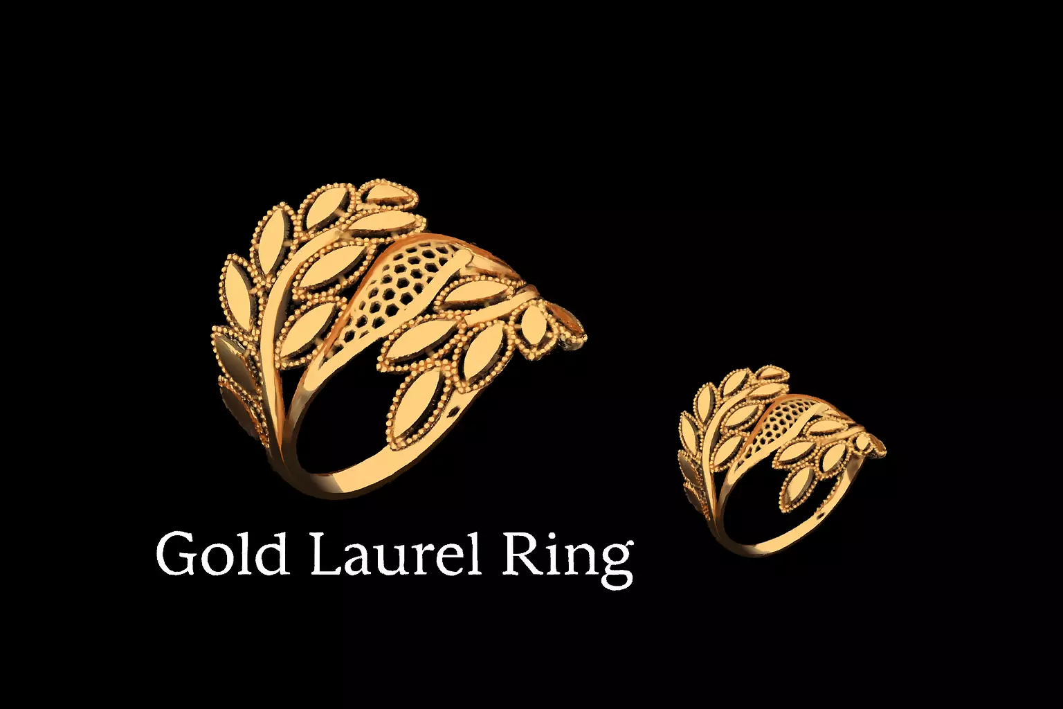 This 3D model presents an elegant gold ring design inspired by laurel leaves, symbolizing victory and timeless beauty. The ring features two symmetrical branches extending from the band, each adorned with elongated, almond-shaped leaves arranged in a graceful arc. Each leaf is bordered with fine beading, adding texture and depth to the design.