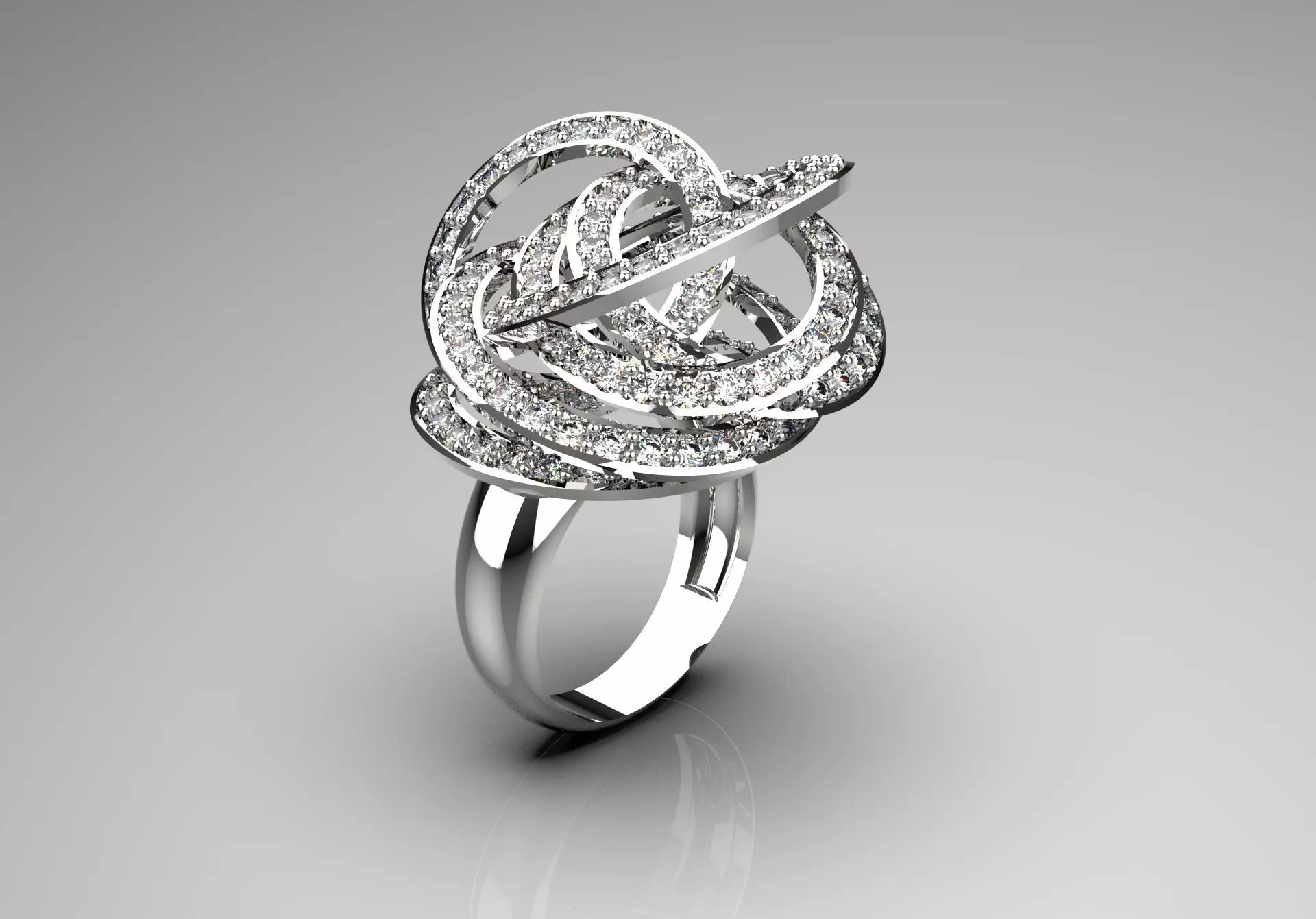 This ring features a striking abstract design, characterized by a series of intertwined white gold bands that create a sense of movement and flow. These bands are adorned with numerous sparkling diamond gemstones, adding to its elegance and brilliance. The setting appears to be made of polished silver or white gold, which enhances the luxurious appearance of the ring. The overall shape resembles a spinning figure, making it a unique piece suitable for a variety of occasions. Its intricate construction demonstrates high quality and attention to detail.