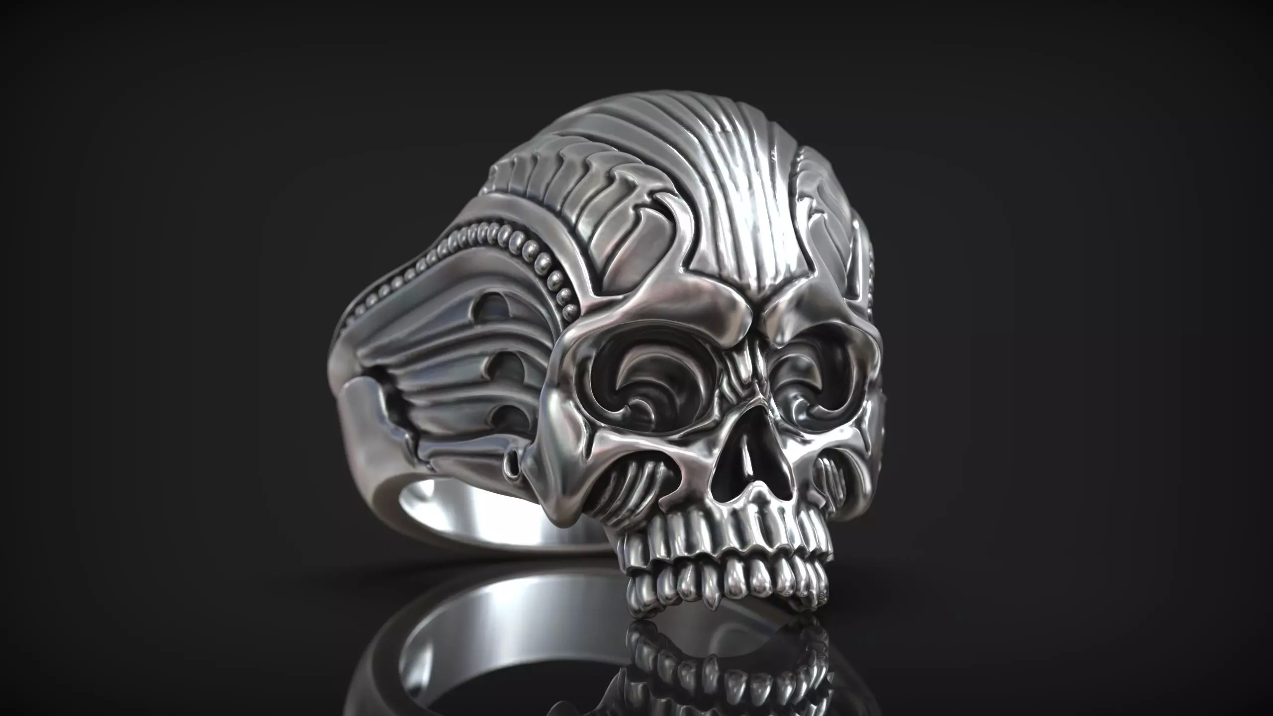 This 3D model presents a striking skull ring inspired by the biomechanical art of H.R. Giger. Designed in a bold biker aesthetic, the ring combines organic and mechanical forms into a darkly elegant composition. The skull is sculpted with flowing metallic ridges, intricate biomech engravings, and symmetrical structural patterns that give it a surreal, otherworldly appearance. Its high-polished metal surface reflects light dramatically, emphasizing every contour and detail. Perfect for jewelry designers, 3D artists, and fans of Giger’s biomechanical universe, this model embodies both power and precision, making it ideal for 3D printing or digital concept art.