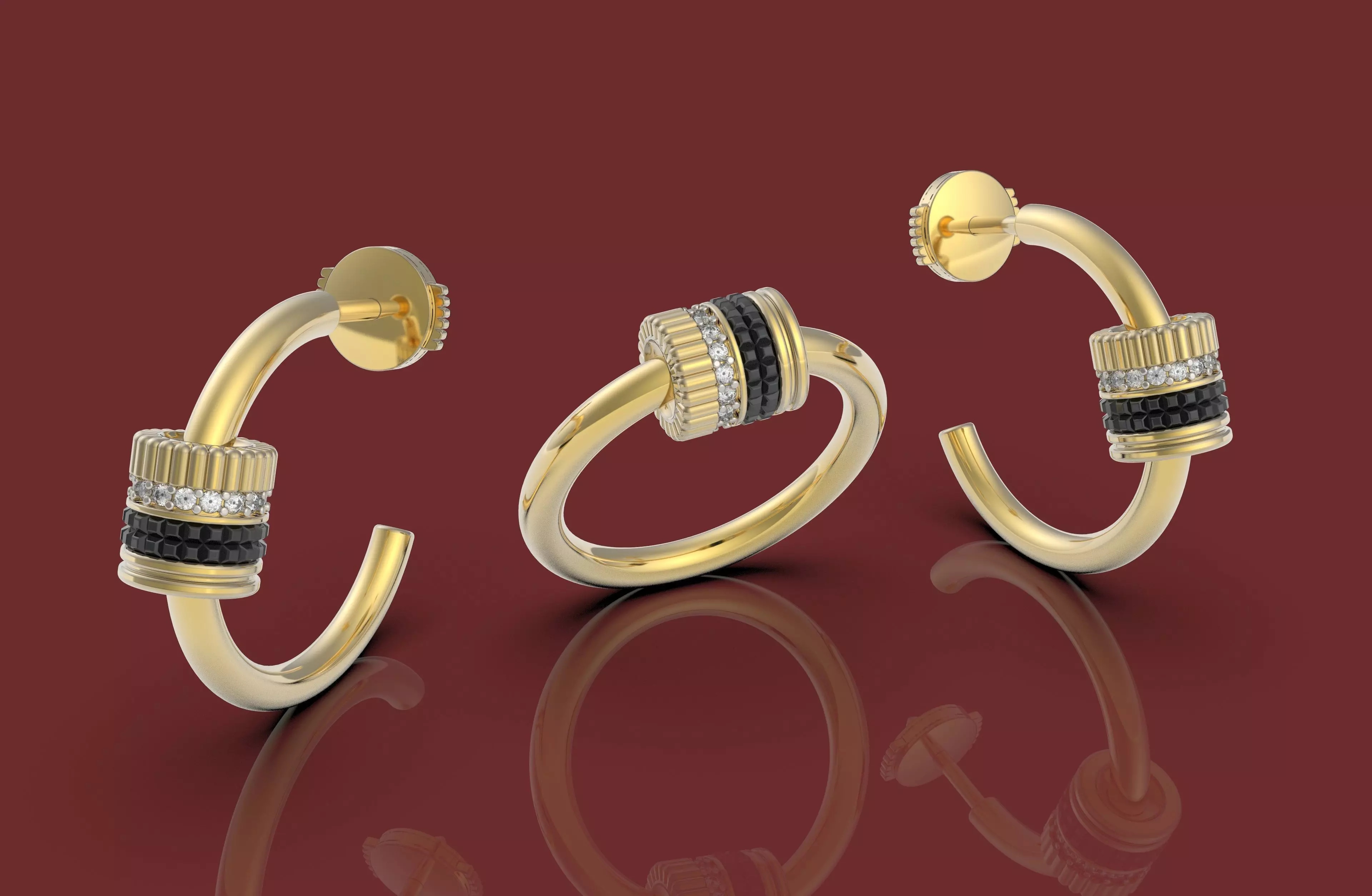 This elegant 3D jewelry set features a matching gold ring and hoop earrings with intricate detailing and luxurious materials. The design showcases polished yellow gold bands accented by alternating rows of black and white gemstones, giving it a sophisticated and modern appeal. The set is designed with precision for realistic rendering and manufacturing visualization.