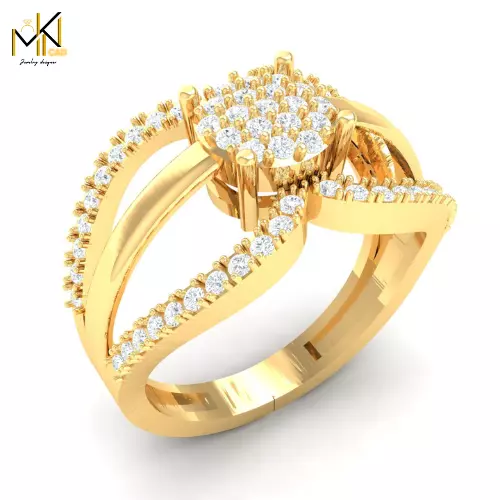This exquisite ring features a stunning cluster of small, round-cut diamonds arranged in a circular pave setting at the center, creating a sparkling focal point that exudes elegance. The band is crafted in 14K or 18K yellow gold, with a unique crossover design where two delicate, diamond-encrusted bands intersect and wrap around the central cluster, adding a modern and dynamic flair. The additional pave-set diamonds along the crossover bands enhance the ring's brilliance, making it a perfect choice for an engagement ring, anniversary gift, or a statement piece for special occasions. The combination of the warm gold and the radiant diamonds offers a harmonious blend of luxury and sophistication.