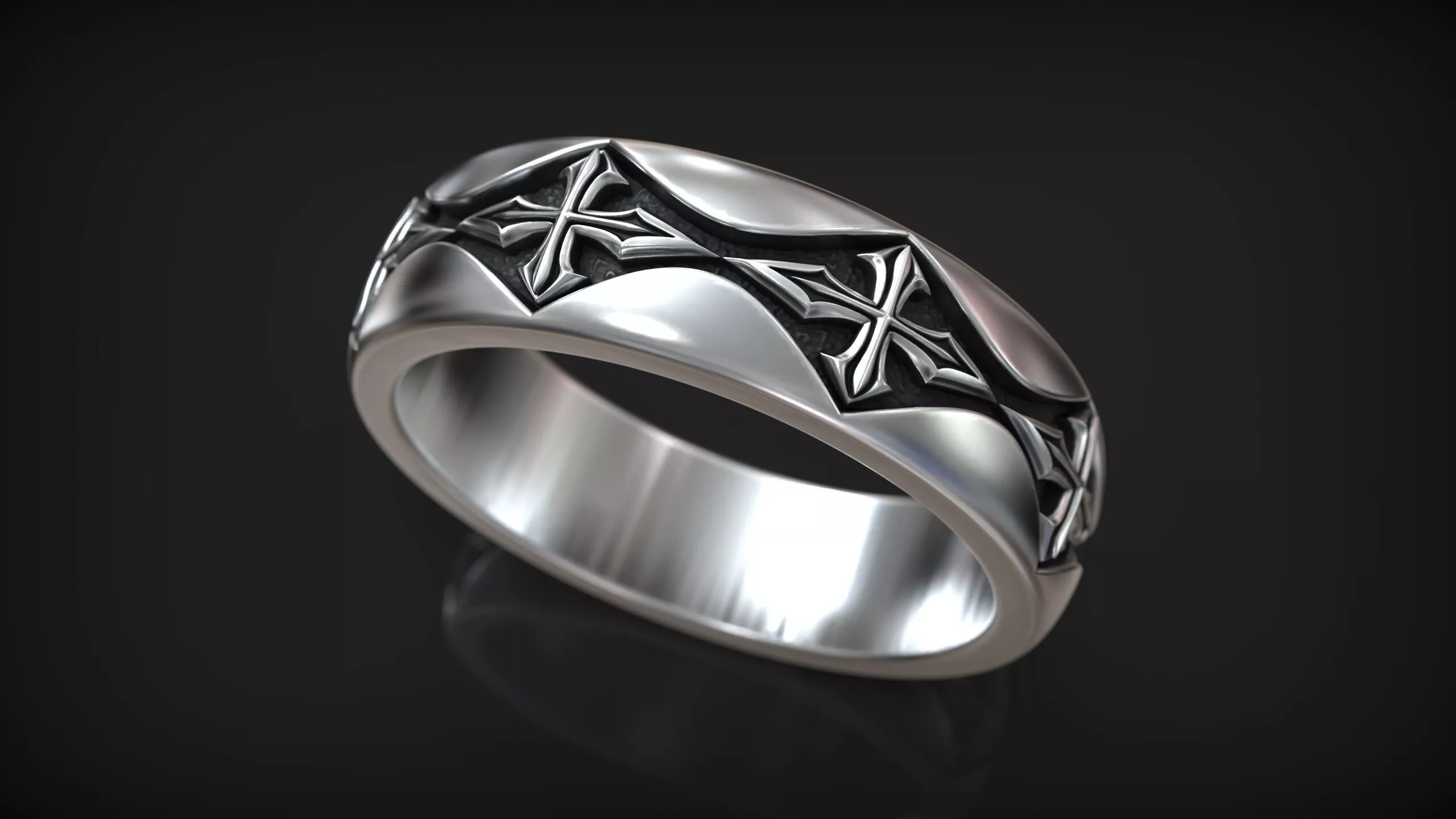 This 3D model showcases a Cross Biker Ring, designed in a bold yet refined gothic style, combining symbolic meaning with a modern, wearable form. The ring features a continuous pattern of stylized crosses embedded into the band, creating a strong visual rhythm and identity.