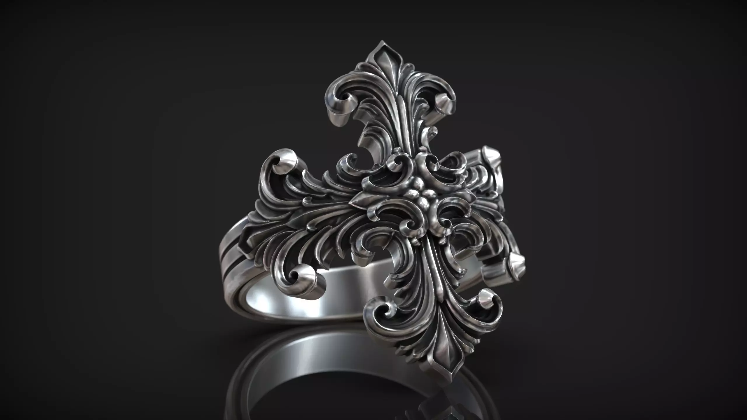 This ornate Gothic cross ring features an expressive baroque-style Christian cross with rich flowing scrolls and deep sculptural relief. The design combines classical religious symbolism with dramatic ornamental detailing, creating a powerful and visually striking statement ring.