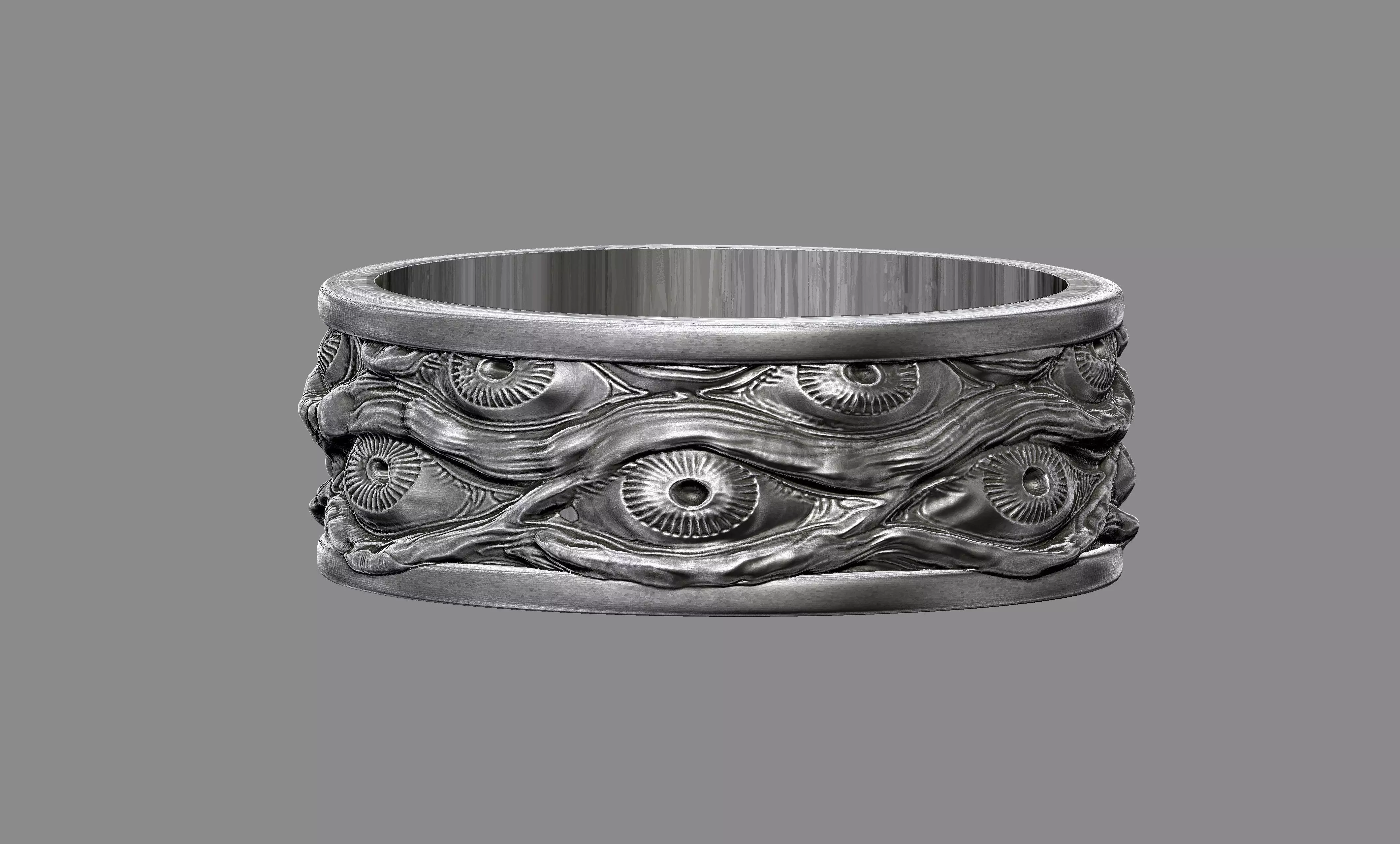 A dark, unsettling ring featuring an endless pattern of watching eyes carved around the band. Inspired by gothic horror and cosmic dread, the repeating design evokes themes of madness, surveillance, and the unknown. Crafted for high-quality 3D printing and suitable for metal casting, this ring is ideal for statement jewellery, horror-themed collections, or bold fantasy designs.