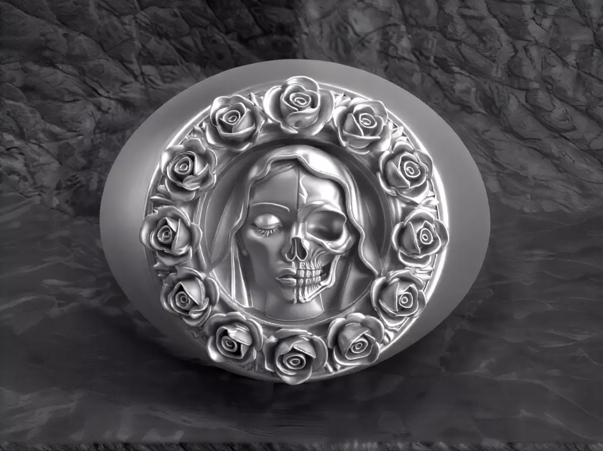 High-quality gothic signet ring featuring a detailed memento mori relief — a female face combined with a skull, framed by a delicate rose ornament. The design blends romantic gothic aesthetics with classic vanitas symbolism, making it ideal for jewelry production, casting, or high-resolution 3D printing.