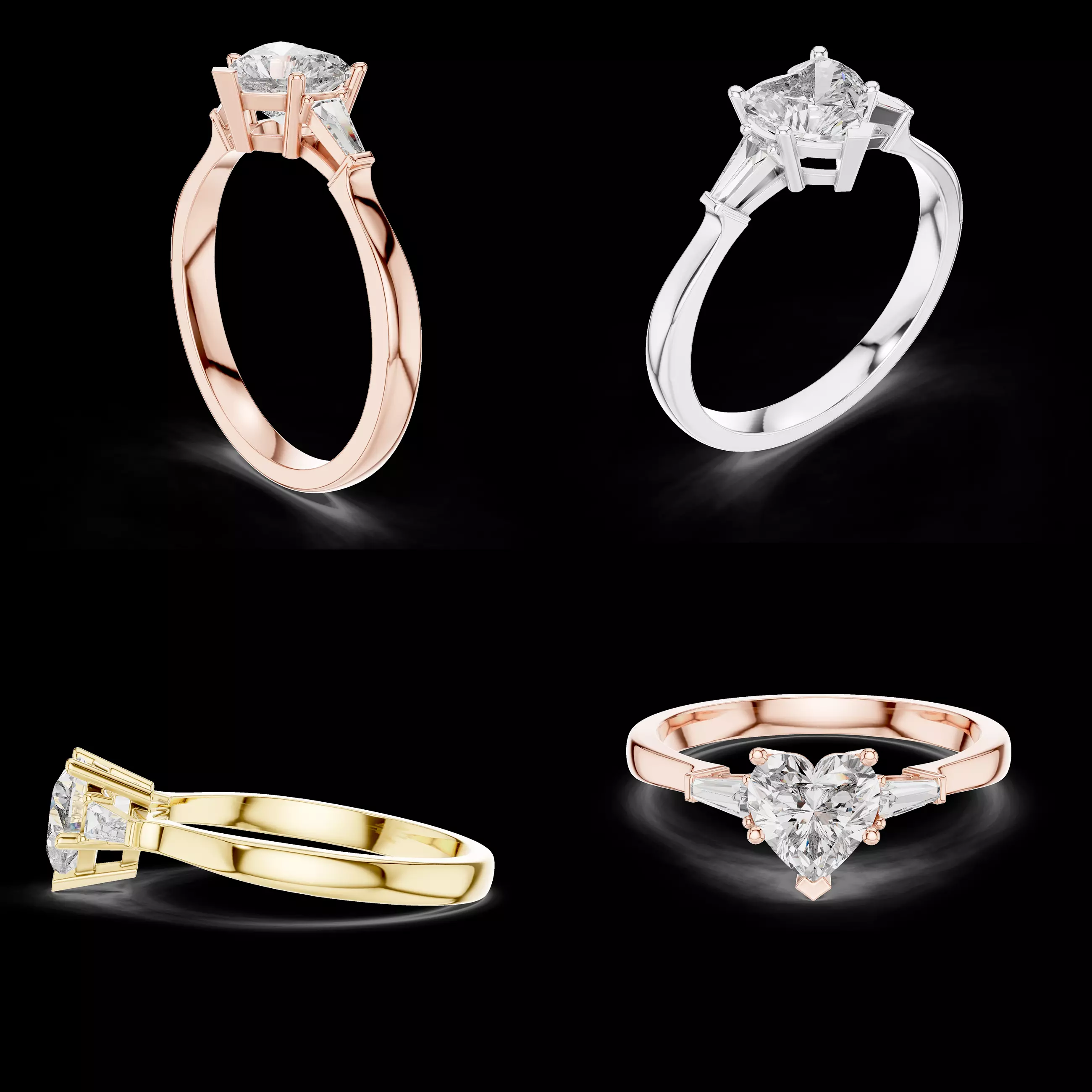 This refined three-stone ring highlights a beautifully shaped heart cut center stone paired with precisely aligned tapered side stones. The heart cut brings a romantic and expressive character to the design while maintaining clean proportions and a balanced profile suitable for premium engagement and bridal jewellery.