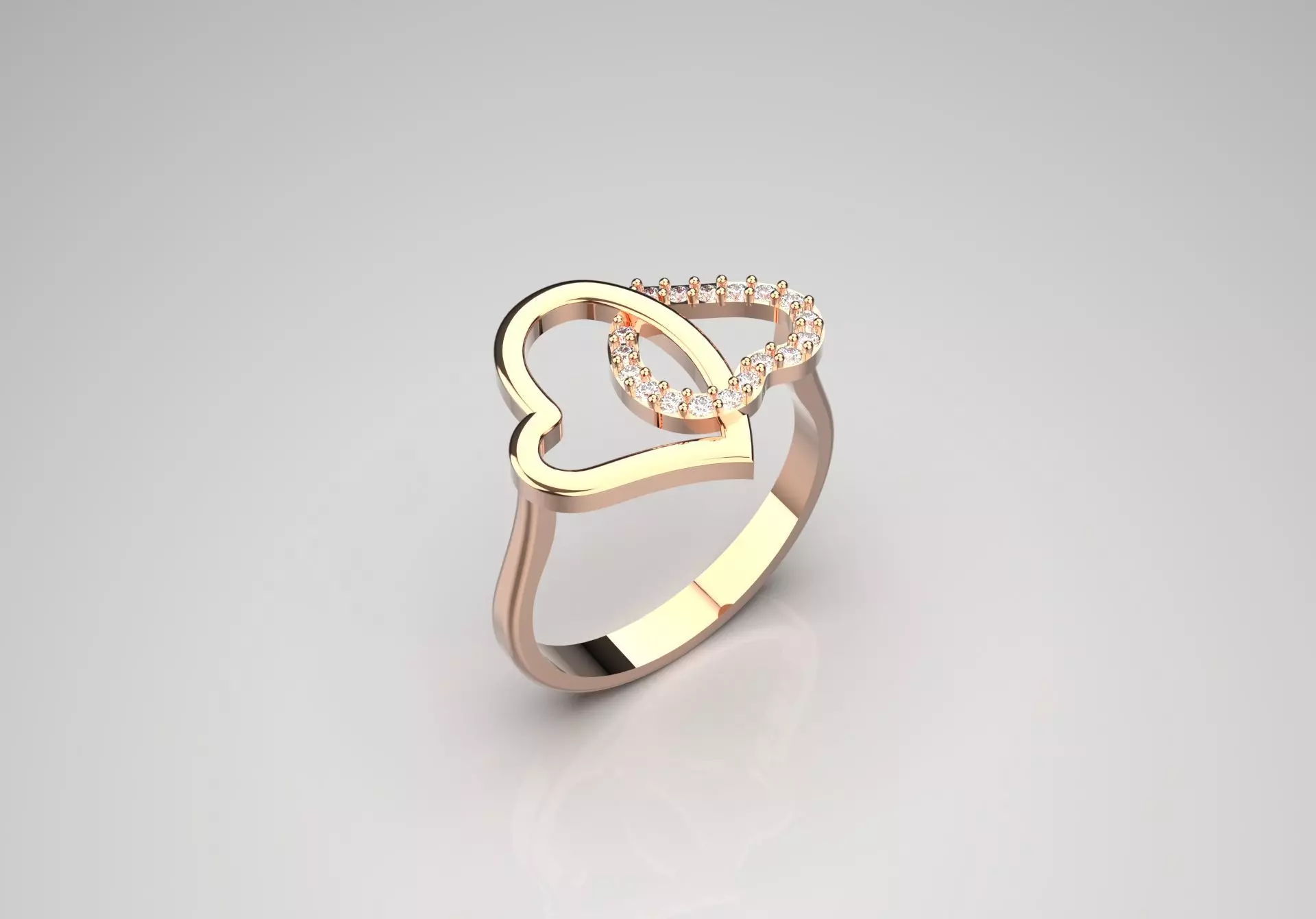 This ring features an attractive heart design made primarily of rose gold. It is a unique open-style silhouette that emphasizes the shape of two intertwined hearts. One heart is polished with rose gold, while the other is adorned with a sparkling row of small diamonds that create a beautiful contrast. The arm of the ring is sleek and smooth, adding to the elegance of the overall piece. The design is both playful and romantic, making it a great accessory for special occasions or everyday wear. The soft tones of the rose gold add warmth and contribute to its charming beauty.