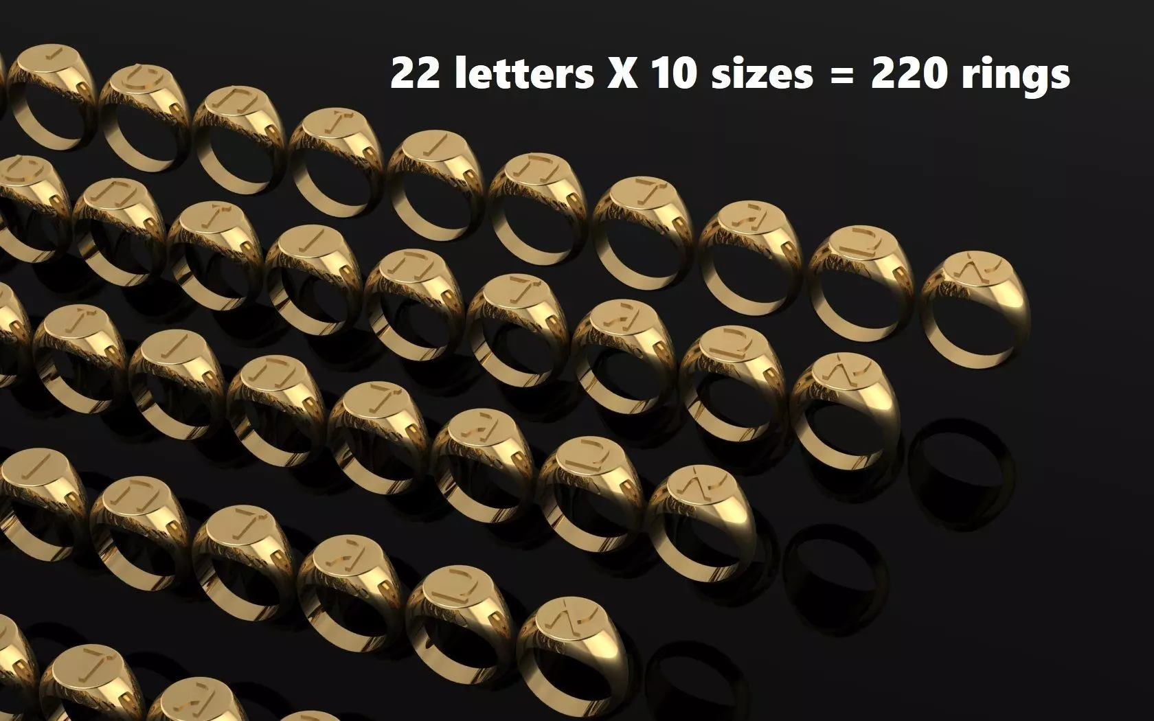 3DM, STL formats included. 3DM files contains all the rings. 220 STL files are named according to letter and size, in order to be easily found.