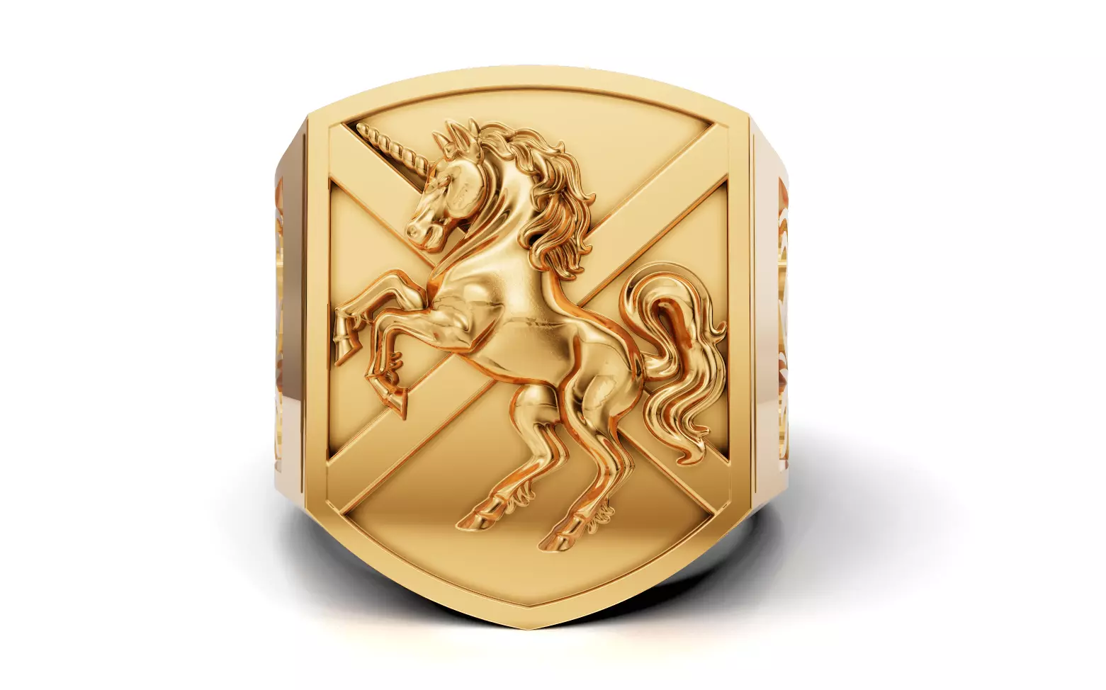 Ready-to-print CAD model for a massive, high-luxury Unicorn Shield Signet Ring. This extraordinary design features a rearing unicorn—a symbol of purity, grace, and untamable power—rendered in crisp high relief. The unicorn is set against a traditional heraldic shield containing a Saltire cross.