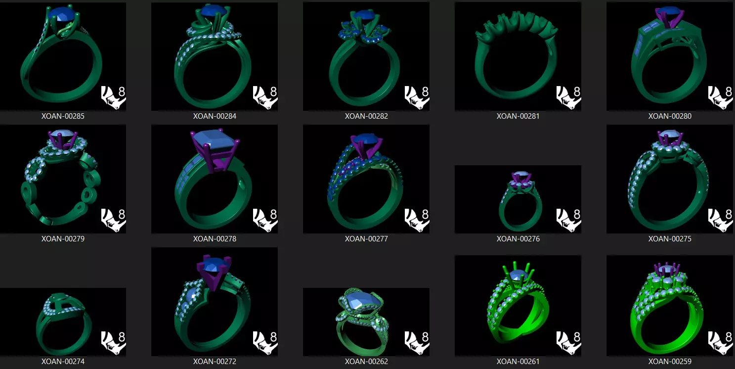High End Engagement and Fashion Ring Collection 100 pieces 3D print modelHigh-End Engagement & Fashion Ring CollectionWe are proud to present our exclusive collection of 15 exquisite 3D ring designs. These rings are professionally designed using CAD/CAM software, ready for 3D printing (wax, resin) and metal casting (gold, silver, platinum).Collection HighlightsDiverse Designs: The collection includes many popular ring styles, from the classic Solitaire style, focusing on a single center stone, to Pavé shank designs (ring band with pavé stones), Halo designs (center stone surrounded by a band of smaller stones), and artistic twisted and curved band styles.Versatile Center Stones: Designs primarily use round cuts for the center stone, with a wide range of color options (blue, green, purple). You can easily adjust the prong and setting size to fit various gemstones such as diamonds, sapphires, moissanite, or semi-precious stones according to customer requirements.