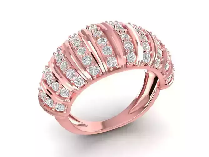 This 3D model features a luxurious dome-shaped ring design with multiple rows of dazzling diamonds, alternating between baguette and round-cut stones. The bold structure reflects confidence and elegance, making it a perfect statement piece for modern women who appreciate refined craftsmanship.