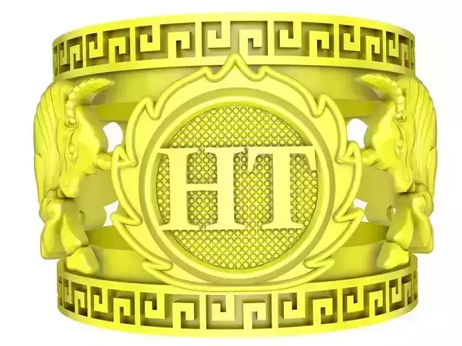 This 3D jewelry model features a bold luxury men’s signet ring inspired by classical Greek key motifs and powerful symbolic detailing. The centerpiece displays a circular emblem with engraved letters, surrounded by a refined textured background that enhances depth and visual strength.