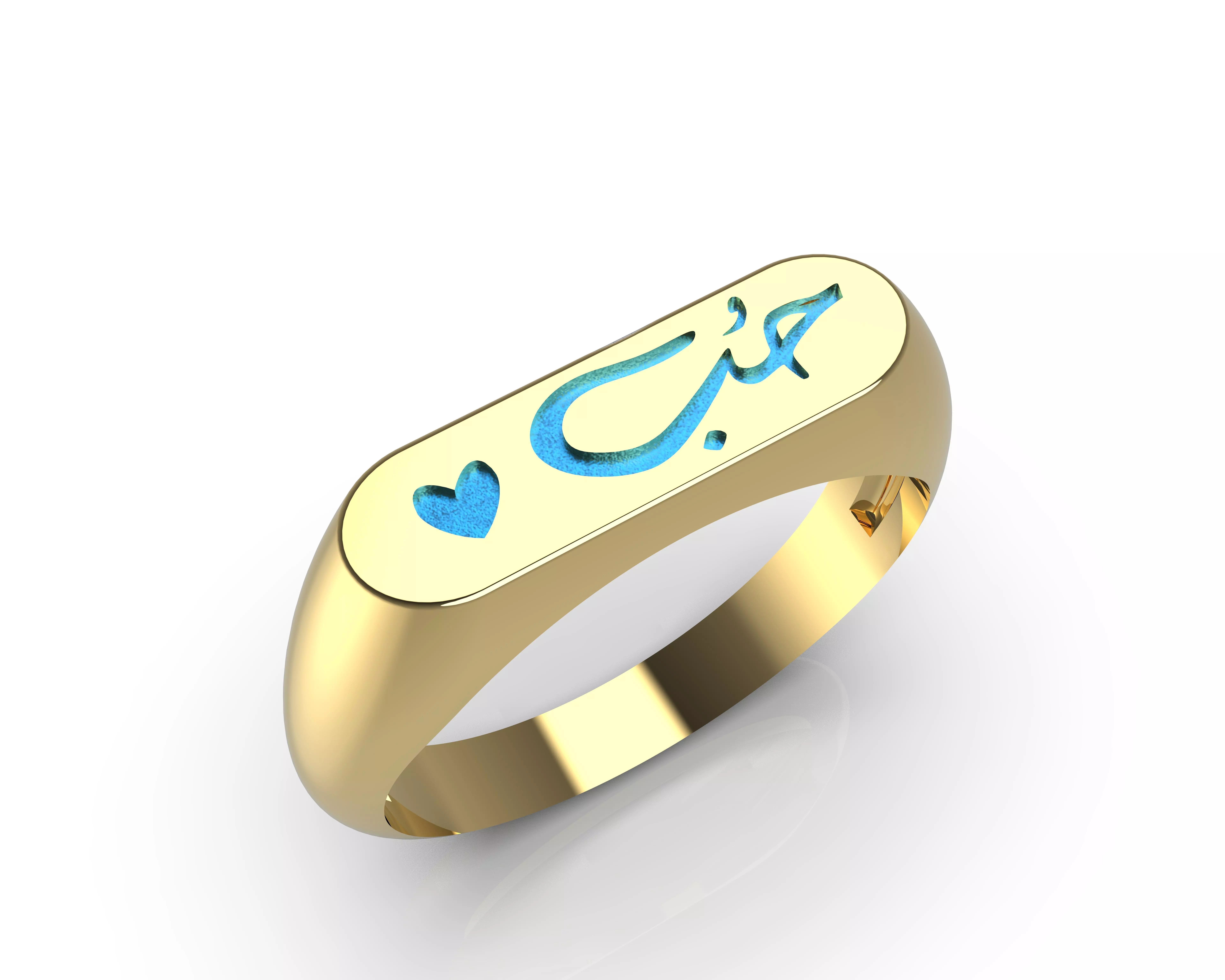 Elegant signet-style ring featuring the word “Hubb” (حب) in Arabic, meaning love, accompanied by a heart motif.