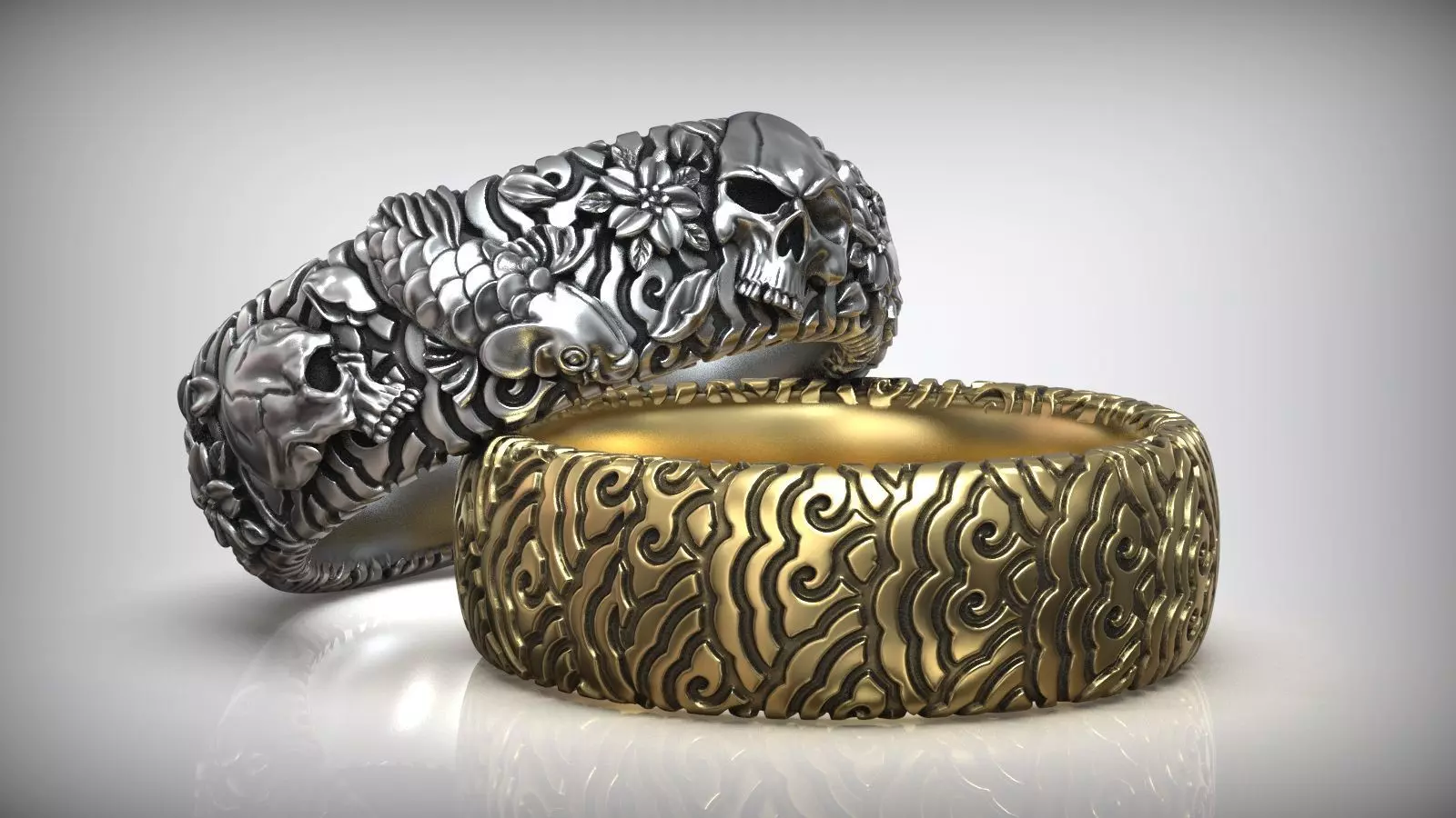 Japanese Skulls and Coi Carp Flower Pattern Wedding Band