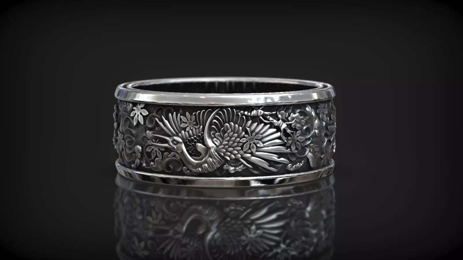 The ring is designed with an intricate Japanese-inspired motif that depicts a graceful crane in mid-flight, surrounded by delicate leaves that seem to swirl in the wind. The crane is beautifully crafted with fine details, including its elegant wings and long neck, and its body is curved slightly to fit comfortably on the finger.The leaves are depicted in a stylized way, with a mix of pointed and curved edges that create a dynamic, almost fluid look. They are arranged around the crane in a way that suggests movement and grace, as if they are dancing on the breeze.The ring itself is made from high-quality materials, with a polished metal band that's both strong and durable. The design is etched into the metal using precise 3D modeling techniques, creating a stunning and realistic effect.Overall, this Japanese-style ring with a crane and swirling leaves is a true work of art, combining traditional design elements with modern technology to create a piece that's both timeless and unique. It's perfect for anyone who appreciates the beauty and elegance of Japanese culture, and who wants to add a touch of sophistication to their jewelry collection.