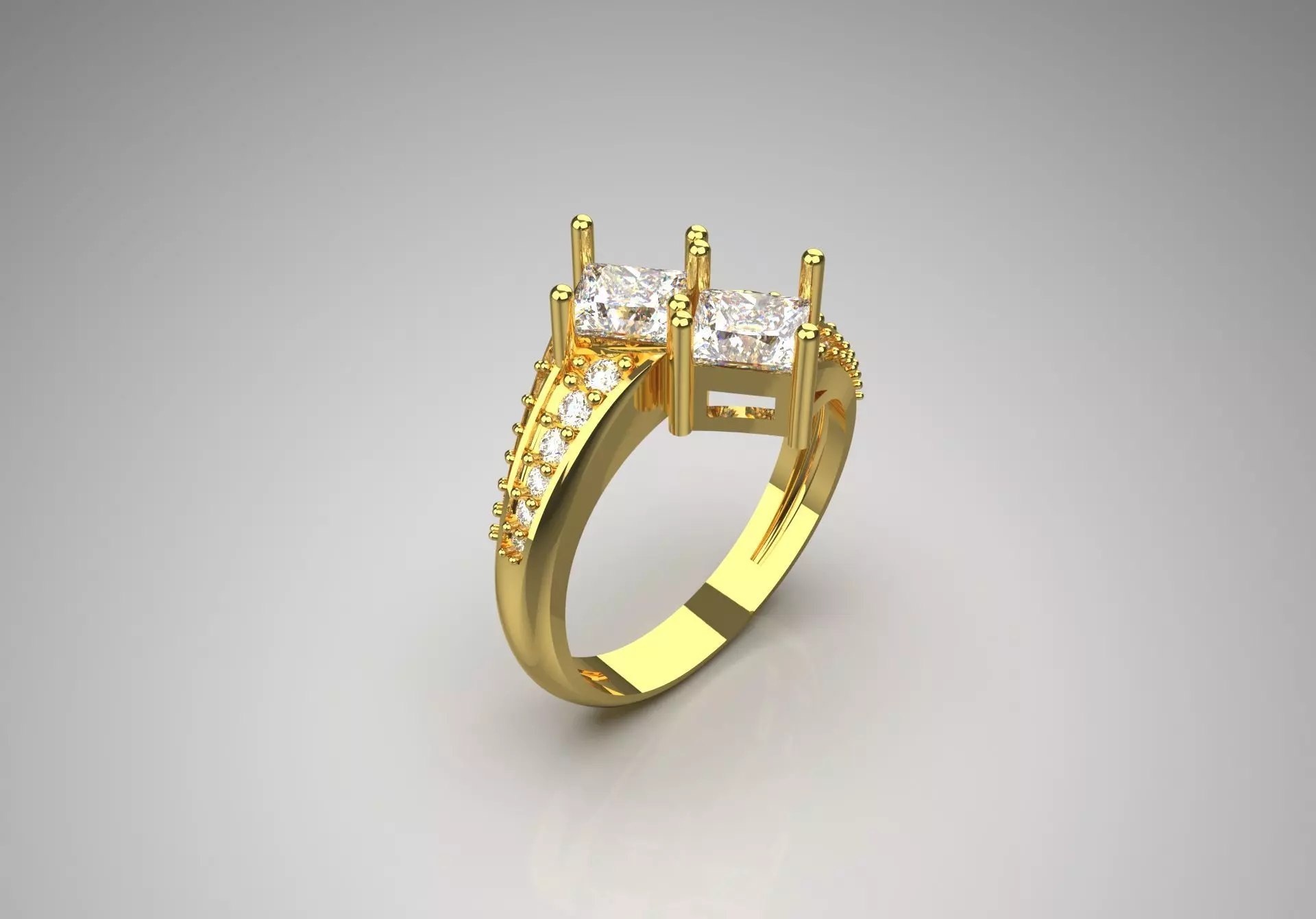 This stunning ring features a modern and elegant design, crafted from shiny yellow gold. At its center, there are two prominent square-cut stones, likely diamonds or high-quality cubic zirconia, set in elevated prong settings that highlight their brilliance.