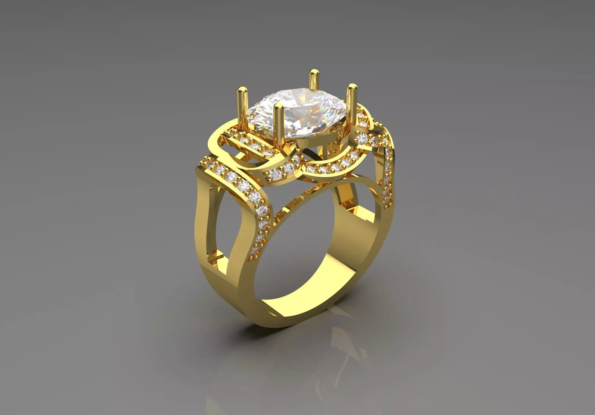 This ring features a stunning gold arm with an intricate design. The centerpiece is an oval-cut diamond gemstone held in place by four prongs, showcasing its clarity and brilliance. Surrounding the gemstone, the arm has delicate curves and is adorned with smaller, sparkling diamonds that enhance its luxurious appearance. The overall design combines modern art with classic elegance, making it a striking piece of jewelry suitable for special occasions or as an engagement ring. The polished gold surface reflects light beautifully, adding to its charm.
