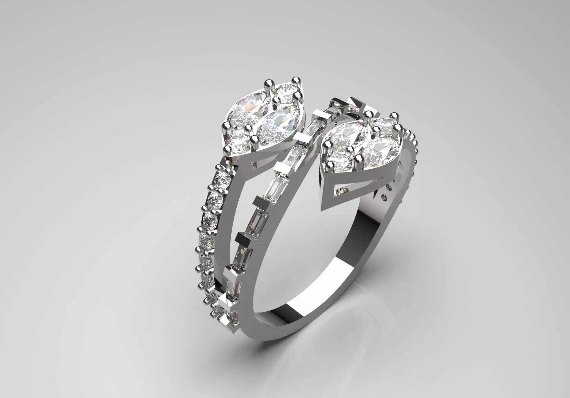 The ring shown in the image has a modern and stylish design. It features a striking arm with a unique shape that seems to wrap around itself. At the center, two vibrant diamond gemstones are set in a prominent position, showcasing their brilliance. Along the arm, several smaller diamonds are arranged, adding to the brilliance. The intricate details and curved shape give the ring a contemporary feel, making it suitable for both casual and formal occasions. The dimensions indicate a well-proportioned piece that emphasizes its elegant design.