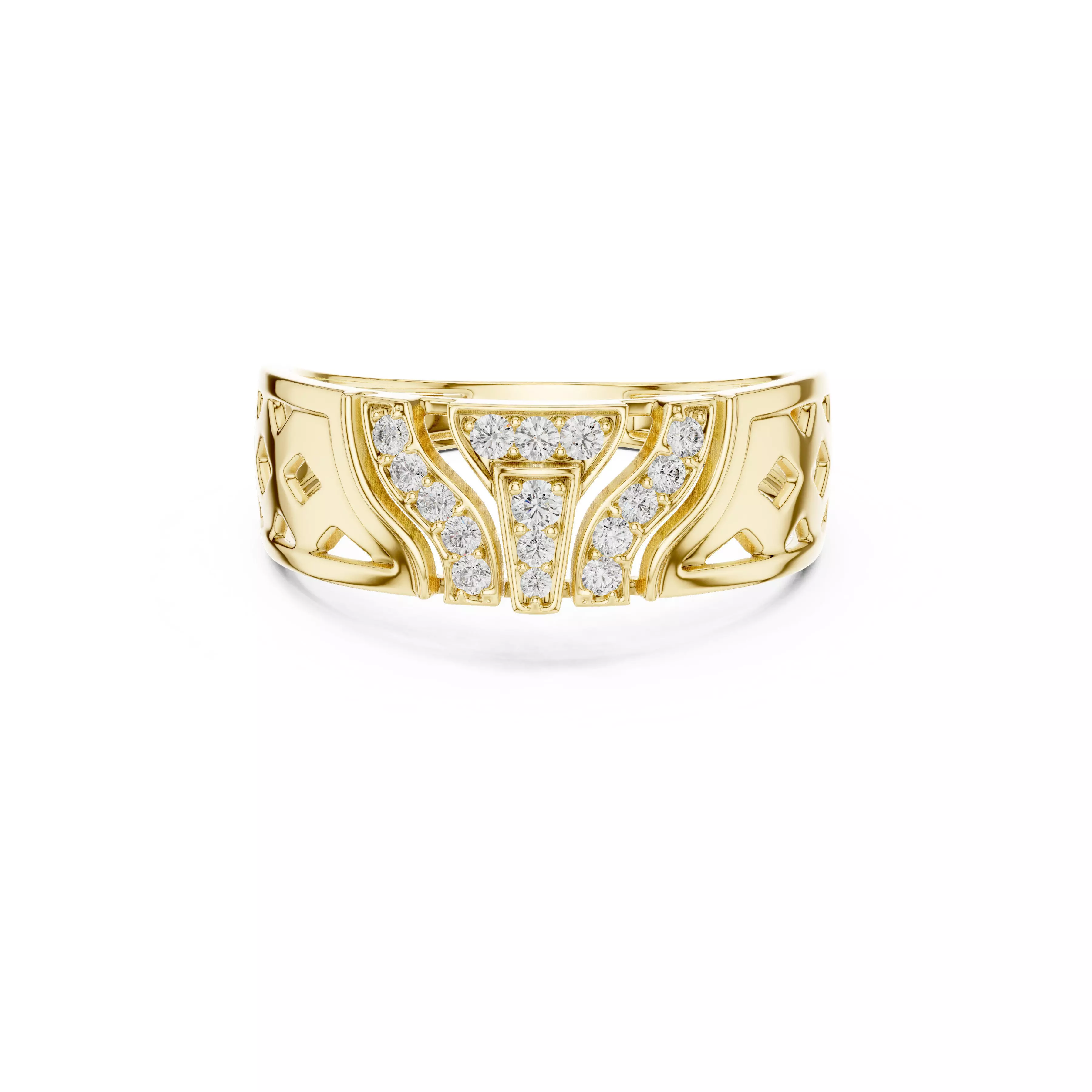 The wide signet-style band ensures a strong presence on the finger, while its smooth polished surfaces contrast beautifully with the textured diamond sections. The balance between solid gold mass and open detailing creates a dynamic and wearable luxury piece.