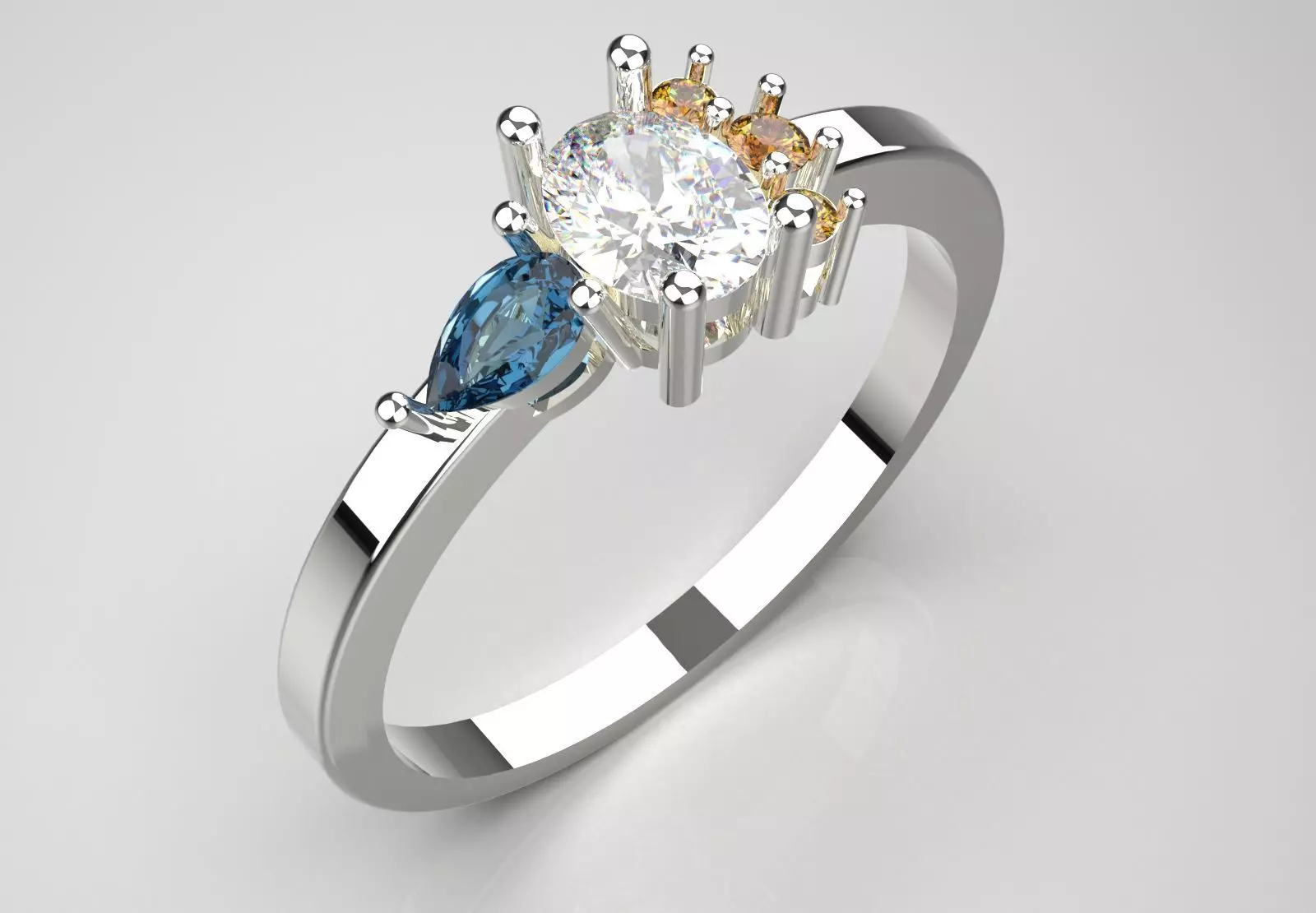 A pear-cut gemstone in blue (possibly blue topaz, sapphire or aquamarine) on one side of the center diamond.