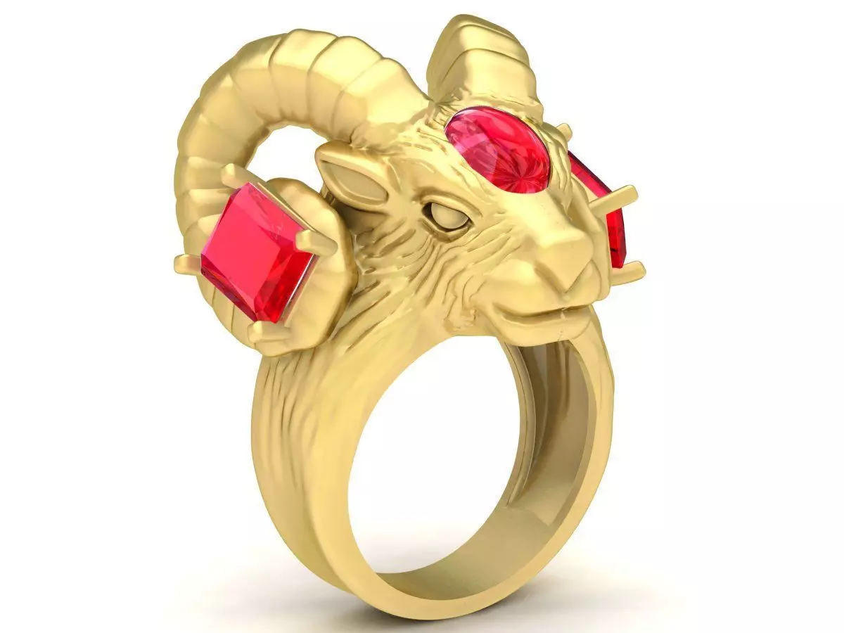 This luxury ram head ruby stone ring is a high quality 3D jewelry model designed for bold and masculine fine jewelry collections. The ring features a detailed sculpted ram head with strong curved horns and expressive facial contours, symbolizing power, determination, and leadership. Multiple faceted ruby stones are set around the design, creating a striking contrast against the metal and enhancing the ring’s dramatic presence.