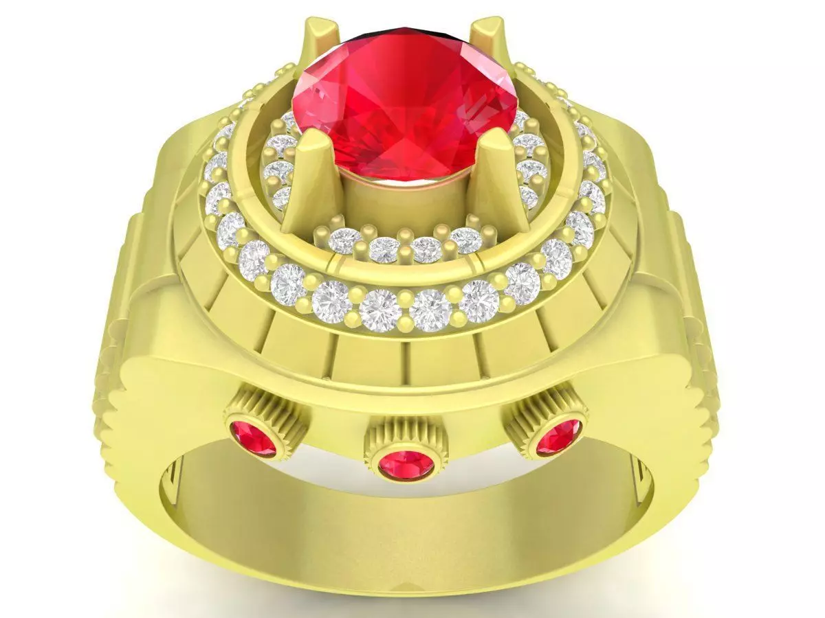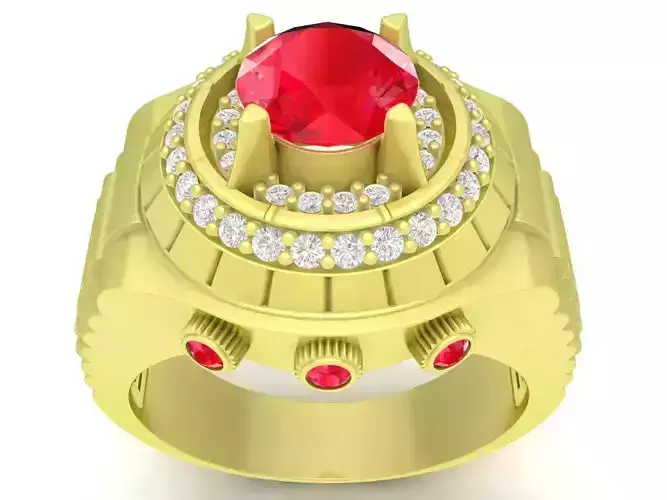 This luxury halo gemstone men ring is a bold and powerful 3D jewelry model featuring a large round center stone surrounded by a detailed halo setting. The solid band structure combined with accent stones creates a strong, masculine appearance while maintaining refined elegance.