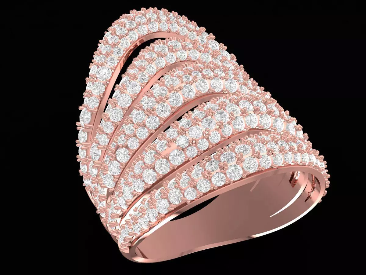 This is a luxury 3D jewelry model of a multi-layer women’s ring featuring an artistic flowing design with multiple curved bands. Each layer is fully set with pave diamonds, creating a bold, elegant, and high-end appearance.