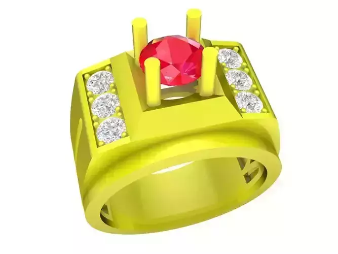 This luxury men ring 3D model features a bold and masculine design centered around a prominent round-cut ruby, framed by two vertical rows of brilliant diamonds on each side. The strong rectangular top and clean architectural lines create a powerful statement ring suitable for high-end men’s jewelry collections.