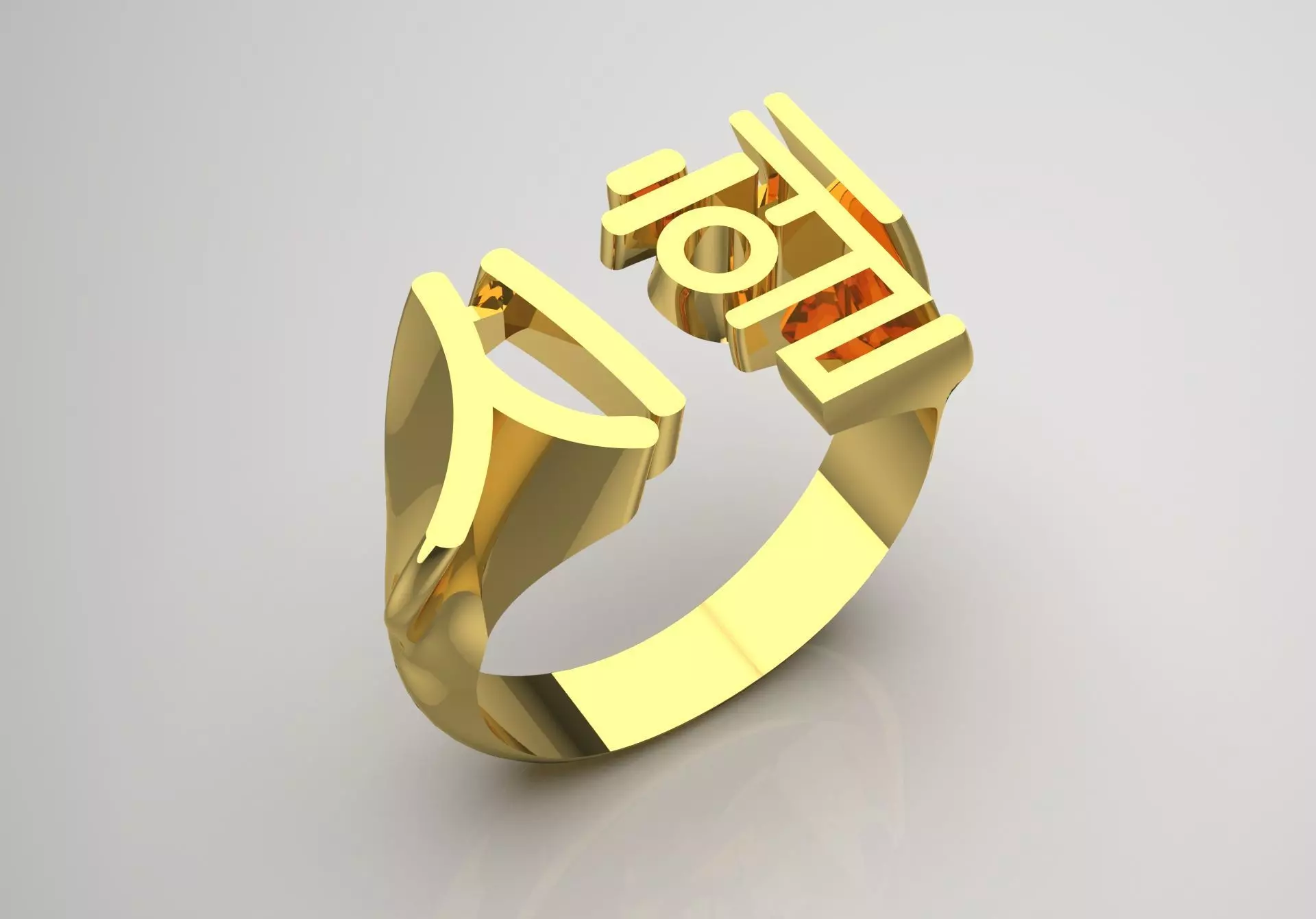 This image shows an interesting and modern ring with a creative design. The ring is made of yellow gold with a shiny and polished surface. The Korean inscriptions are engraved on the ring, which include capital letters and are placed in an artistic way. These letters are designed in a raised shape, giving the ring a special and unique look.