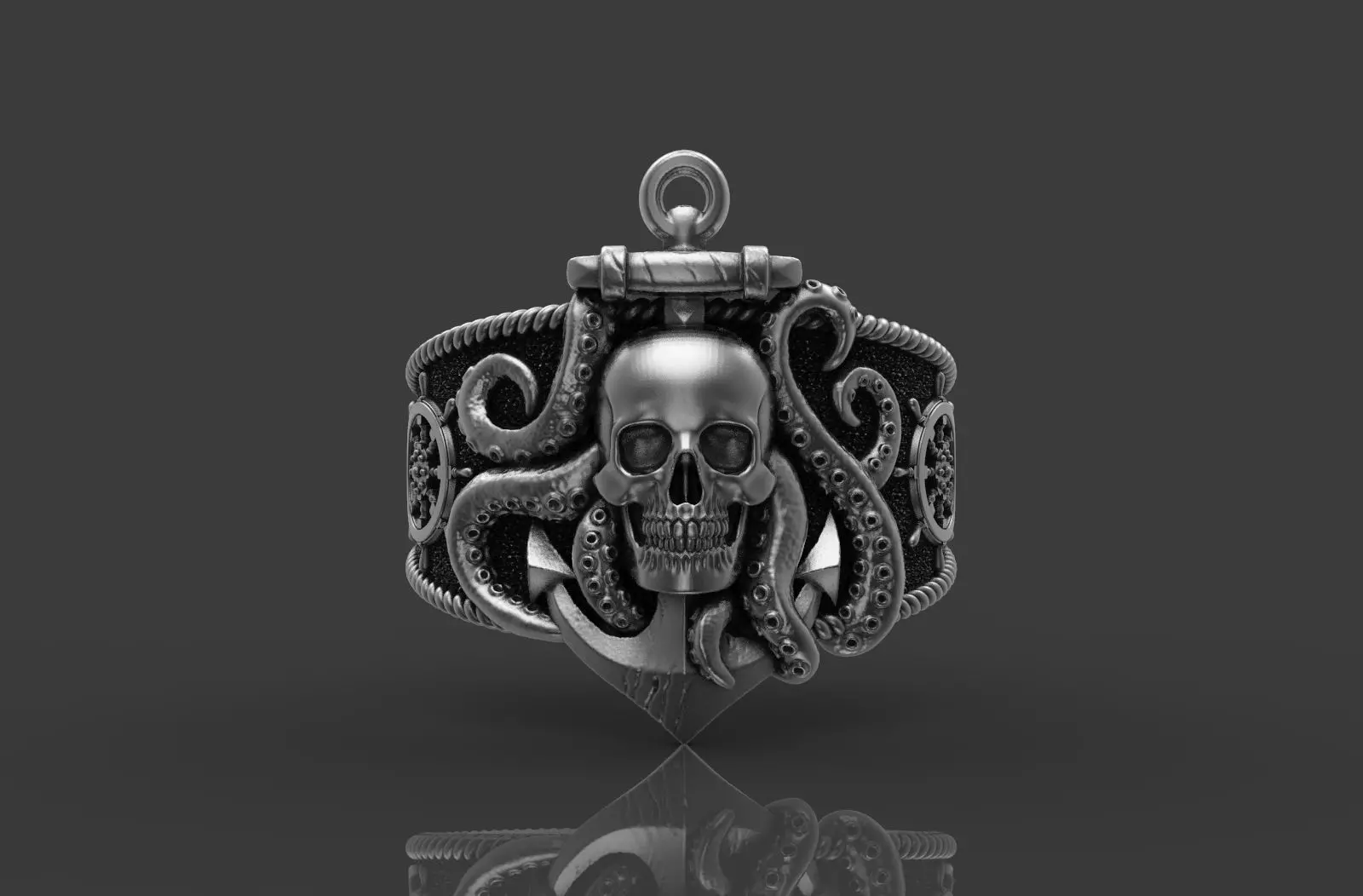 Featuring a meticulously sculpted human skull intertwined with writhing tentacles, this ring embodies the ancient myth of the deep-sea leviathan. The anchor detail reinforces strength, loyalty, and unbreakable resolve, while the overall silhouette delivers an unmistakable pirate-warrior aesthetic.