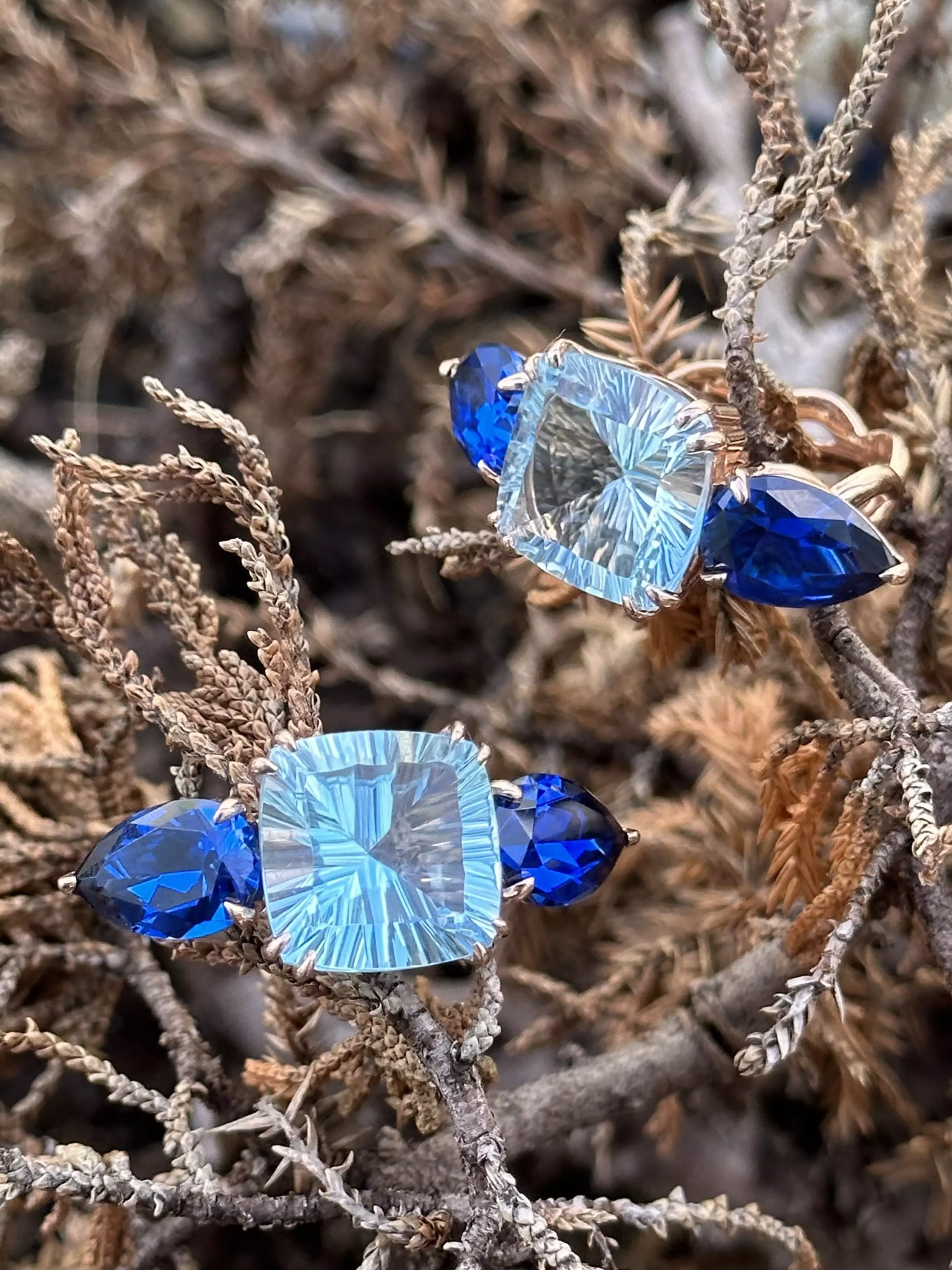 A bold and luxurious 3-stone ring featuring a large cushion-cut center stone set with elegant prongs, flanked by two pear-shaped side stones. The dramatic contrast of stone shapes and sizes creates a striking balance of brilliance and color — perfect for standout fine jewelry pieces.
