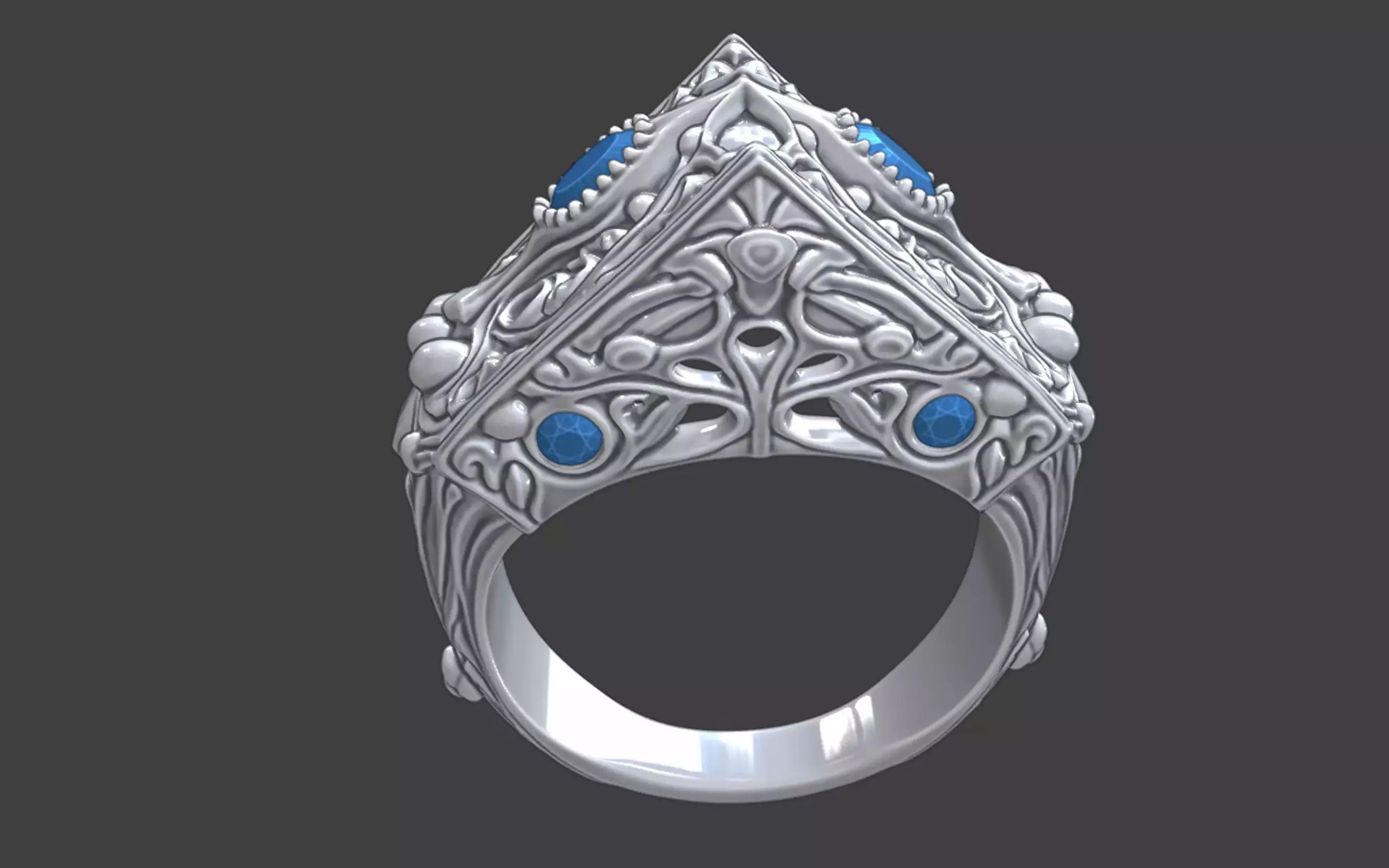 A bold and elegant silver ring featuring a sculpted top with two sides converging to a sharp edge, creating a striking visual silhouette. The design incorporates two small faceted gemstones on the top and four additional stones along the sides, adding sparkle and depth to the intricate structure. Despite its large ornamental volume, the ring maintainsits wlow weight for comfortable wear, with detailed textures and clean lines optimized for production.