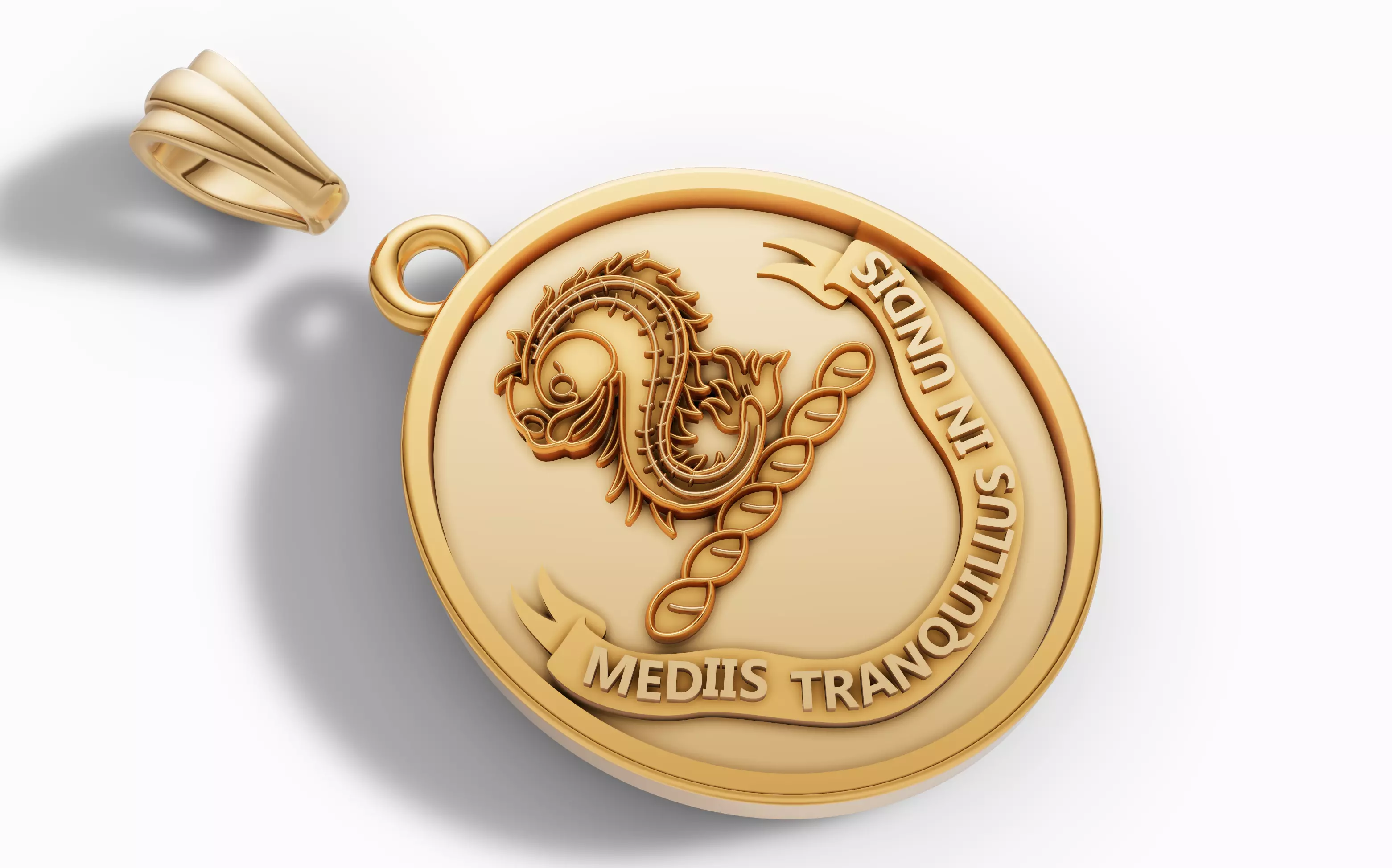 Ready-to-print CAD model for a classic Heraldic Crest Medallion. The design showcases a detailed sea-serpent emblem above a traditional ribbon banner inscribed with the Latin motto MEDIIS TRANQUILLUS IN UNDIS.