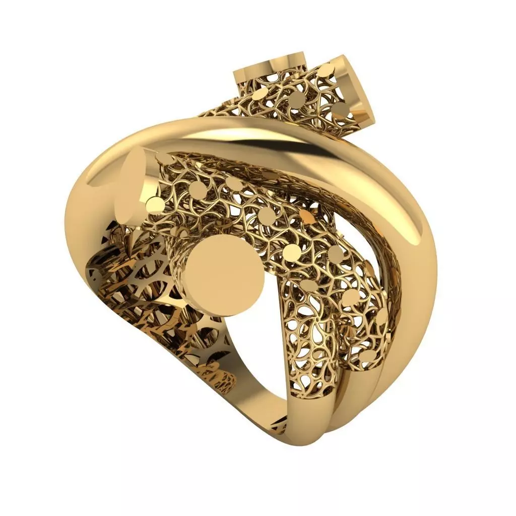 This is a high-quality fusion-style gold ring 3D model, designed for professional jewelry manufacturing, 3D printing, and rendering. It features a unique, modern design with stone settings and precise geometry.