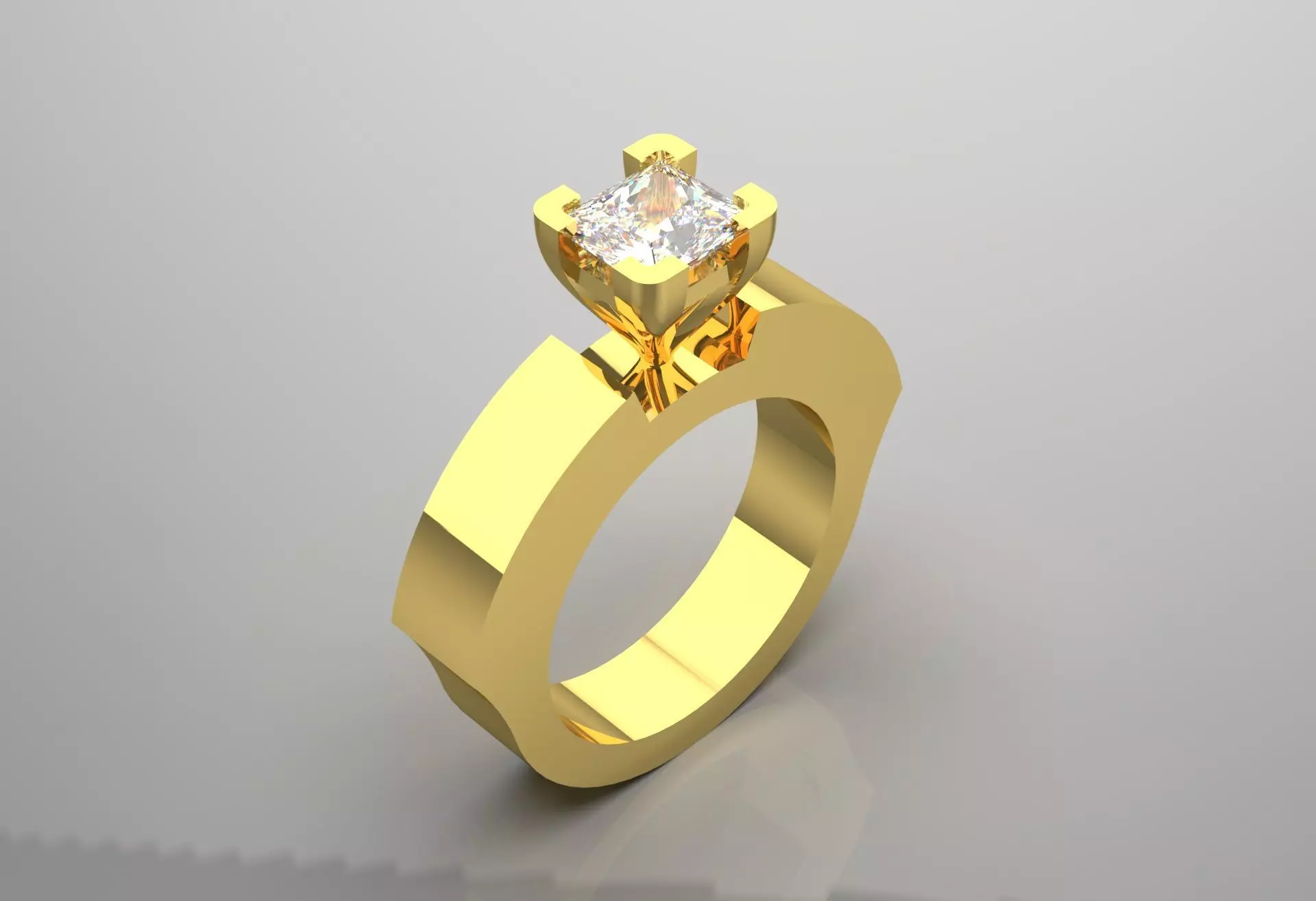 Focus on the presentation of the gem (High-Set Solitaire)Centerpiece Cut: Princess Cut. A modern and attractive cut that has excellent light efficiency due to its large cross-section.