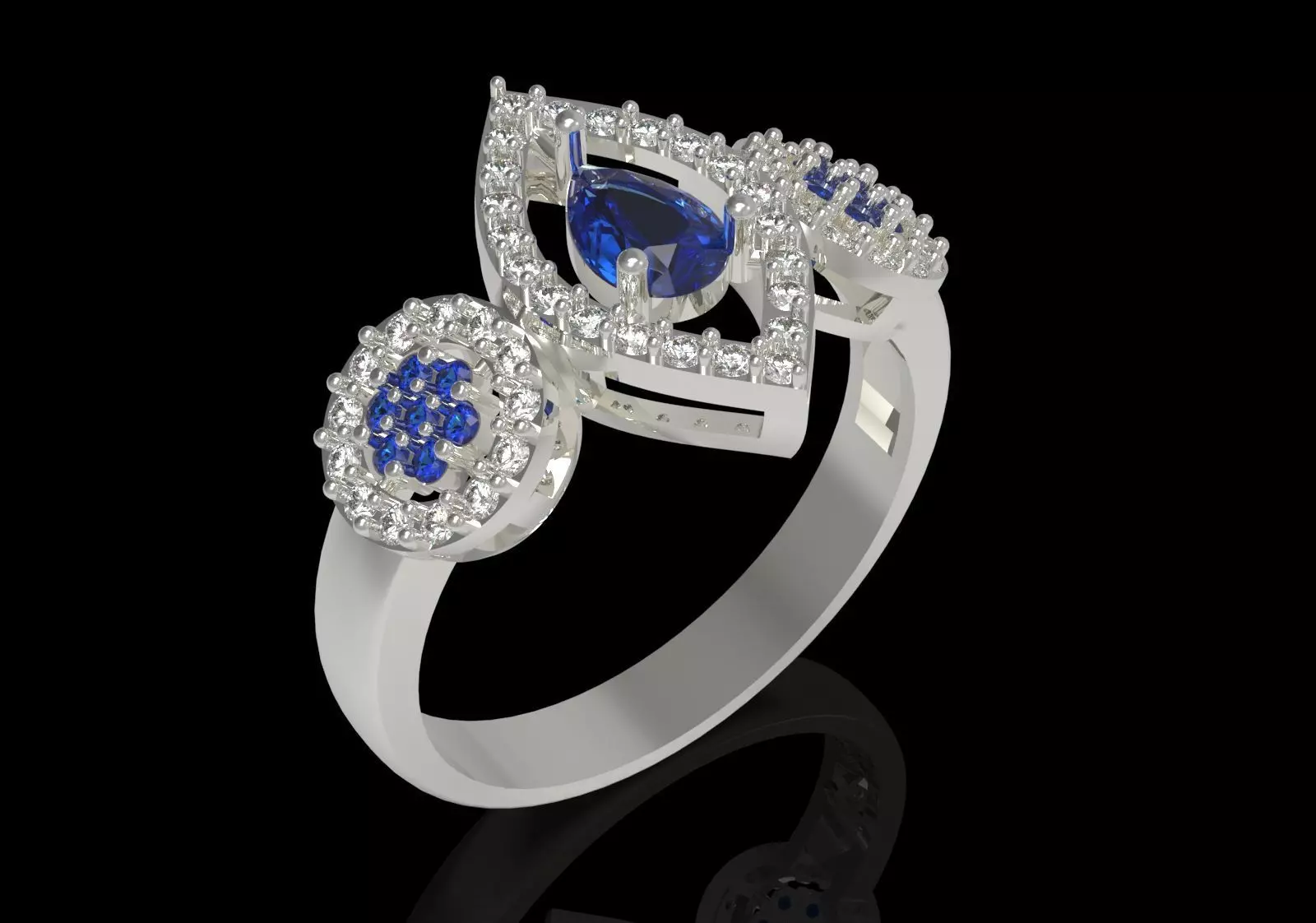 - Center Stone: At the top, a Teardrop/Pear-Cut Sapphire in Deep, Rich Blue color is set.