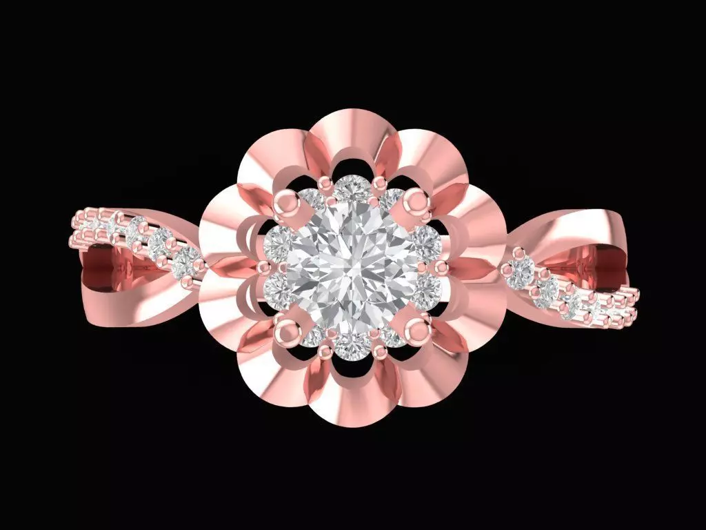 This elegant floral cluster diamond ring features a brilliant round center stone surrounded by a multi-petal arrangement of smaller diamonds, forming a radiant flower motif. The petals are sculpted with soft curvature to reflect light beautifully, while additional diamonds on the band enhance the design’s sparkle and luxurious appeal. The ring is available in rose gold and yellow gold versions, making it suitable for bridal sets, engagement jewelry, or premium fashion collections.