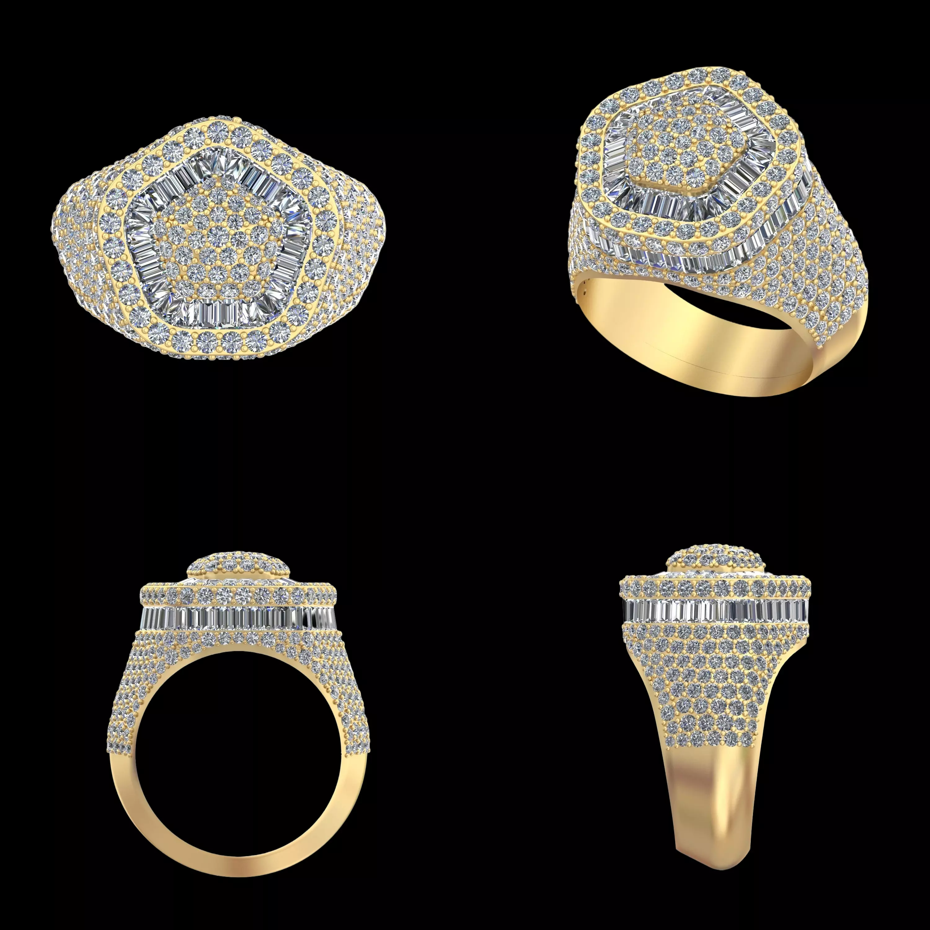 This high-end statement ring design features a bold cushion-shaped layout enhanced with a raised dome cluster center, delivering a powerful three-dimensional luxury appearance. Concentric pavé stone rows build visual depth, while a baguette stone halo adds contrast and brilliance, creating a refined premium look from every viewing angle.