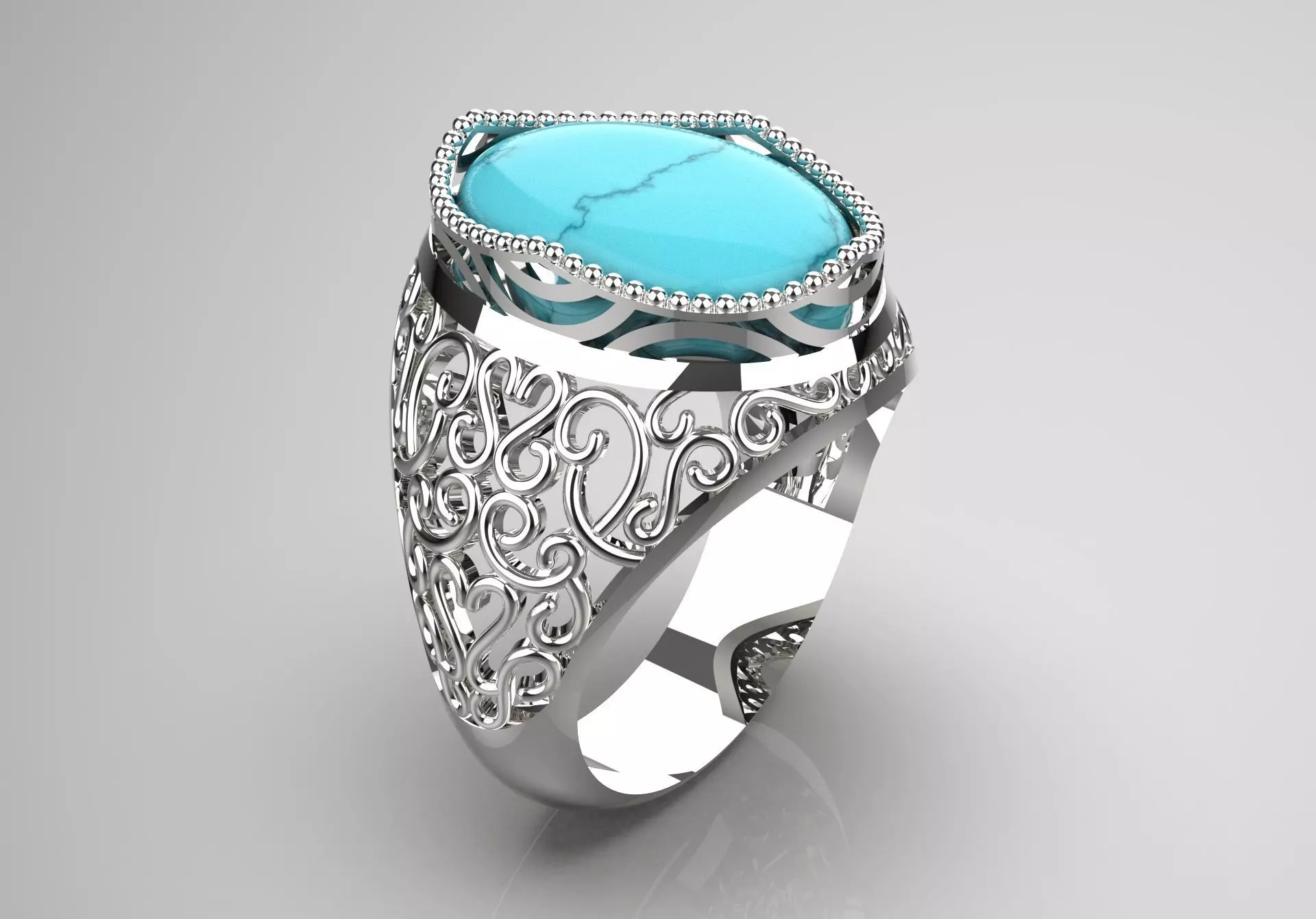 - Overall feel: Luxurious, detailed and with a beautiful color contrast between the white metal and turquoise stone. This ring is very suitable for women who like voluminous, traditional jewelry with colored stones.