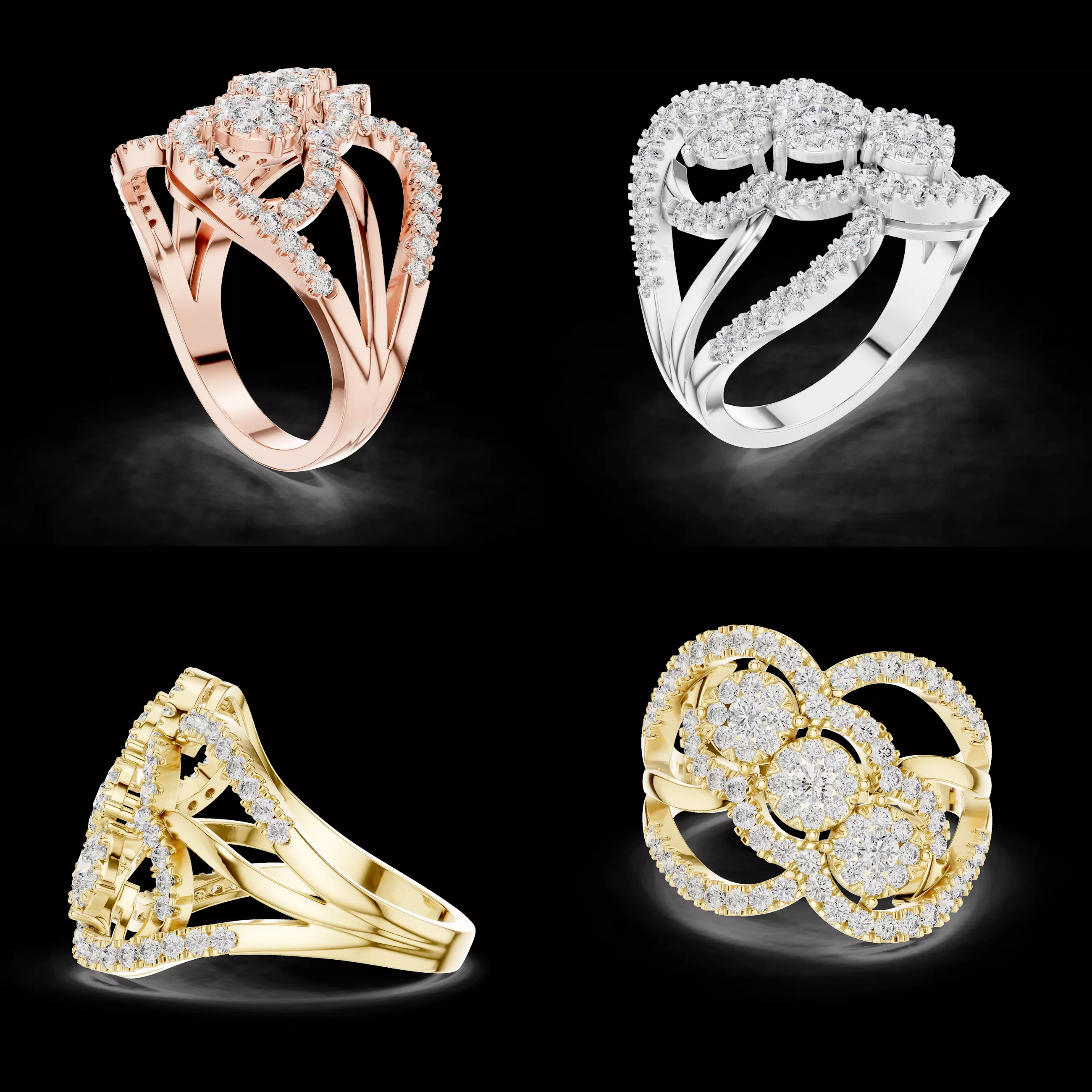 This elegant cocktail ring CAD design showcases a sophisticated multi-layered structure with flowing curves and a bold diamond cluster top. The overlapping shank creates a modern sculptural profile, while the pavé-set stones enhance brilliance from every angle. The top features a floral-inspired cluster arrangement, giving the ring a rich and premium appearance suitable for high-end jewellery collections.