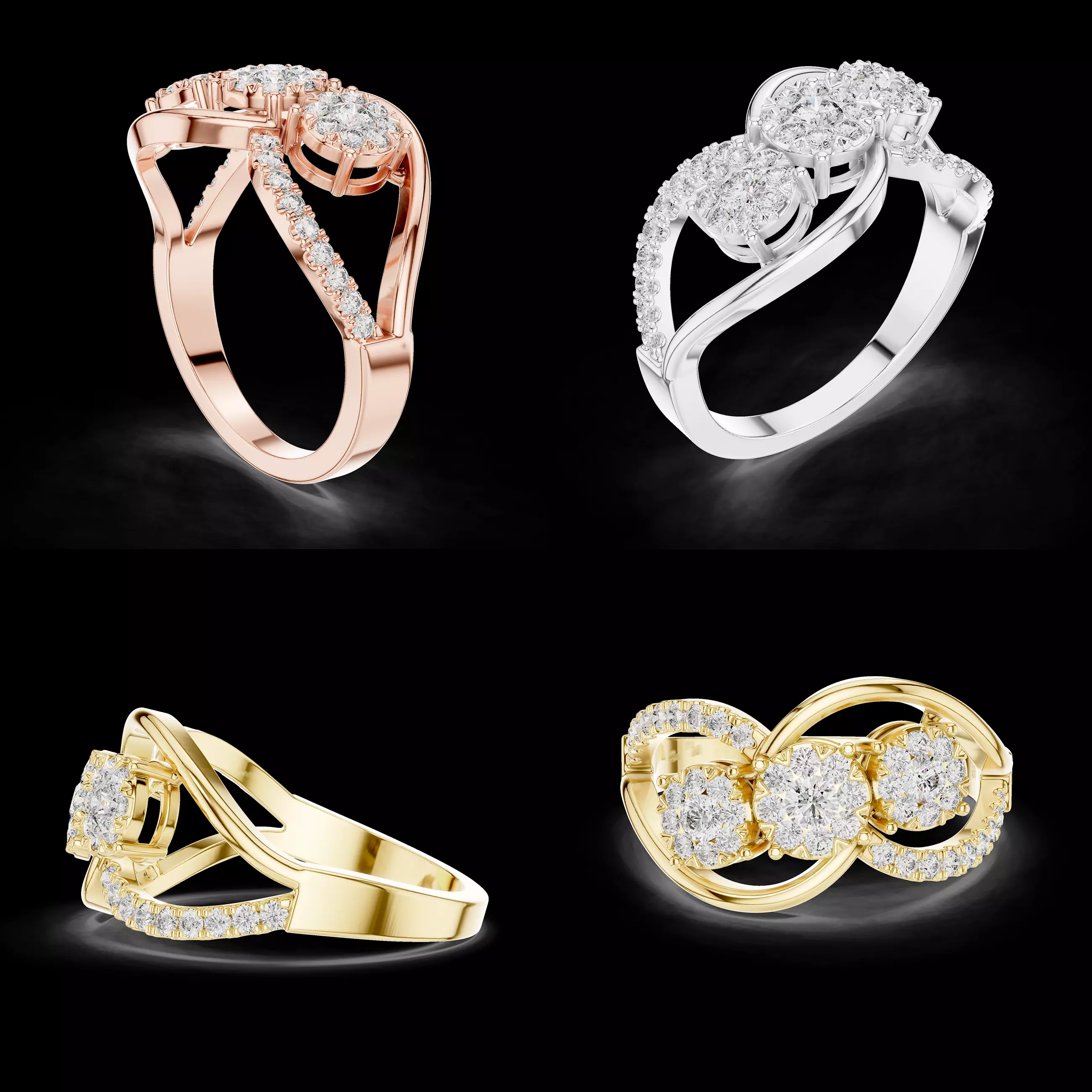 This sophisticated ring CAD design features a graceful crossover shank combined with a bold triple-cluster diamond top. The flowing structure creates a sense of movement while maintaining a strong, luxurious presence. Each cluster is precisely balanced, giving the design a rich visual depth and premium aesthetic.