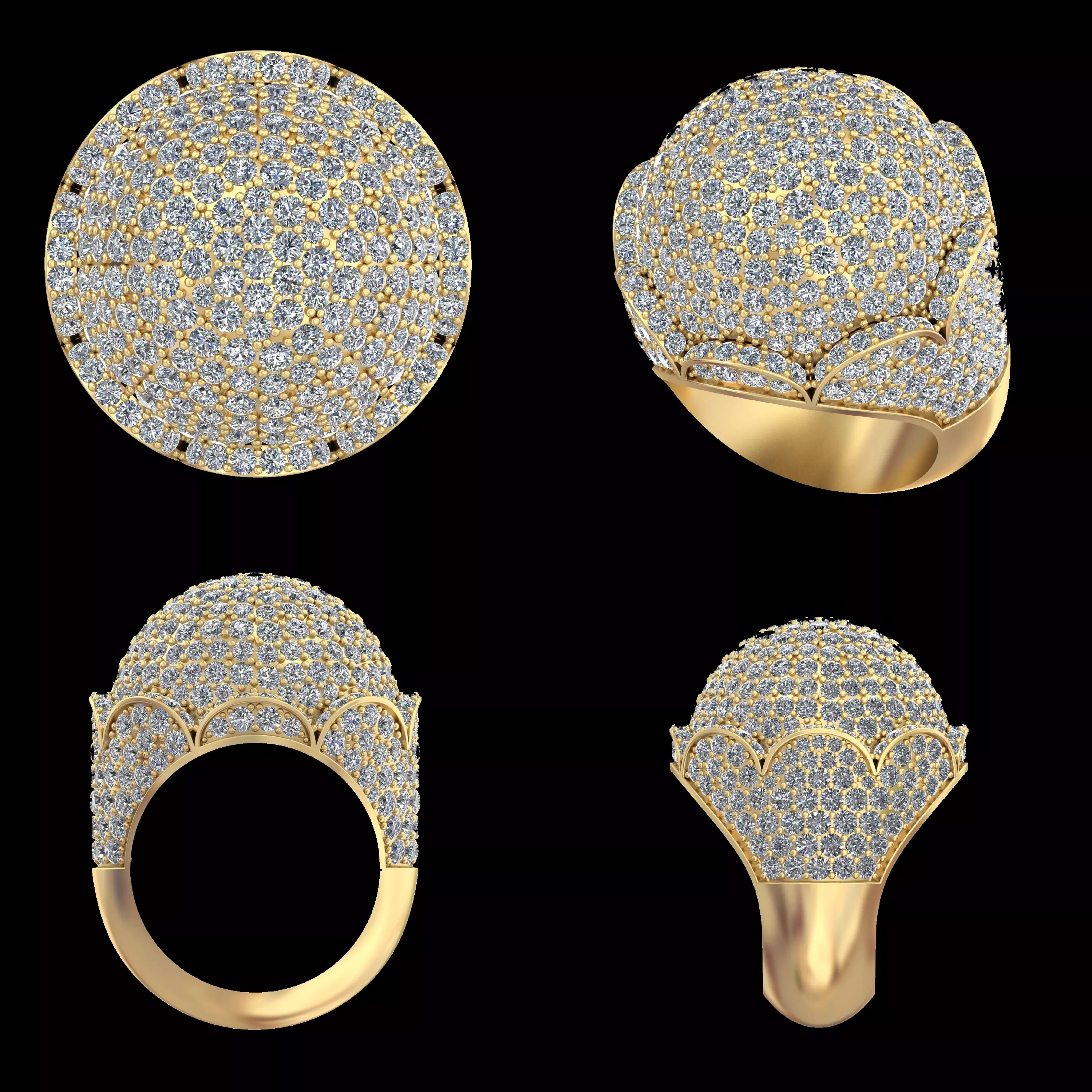This luxury diamond dome pave ring 3D model is created for premium jewellery manufacturing and high-end statement collections. The design features a bold rounded dome top fully covered with precisely arranged pave-set diamonds, delivering exceptional brilliance and a smooth, luxurious visual flow from every angle.