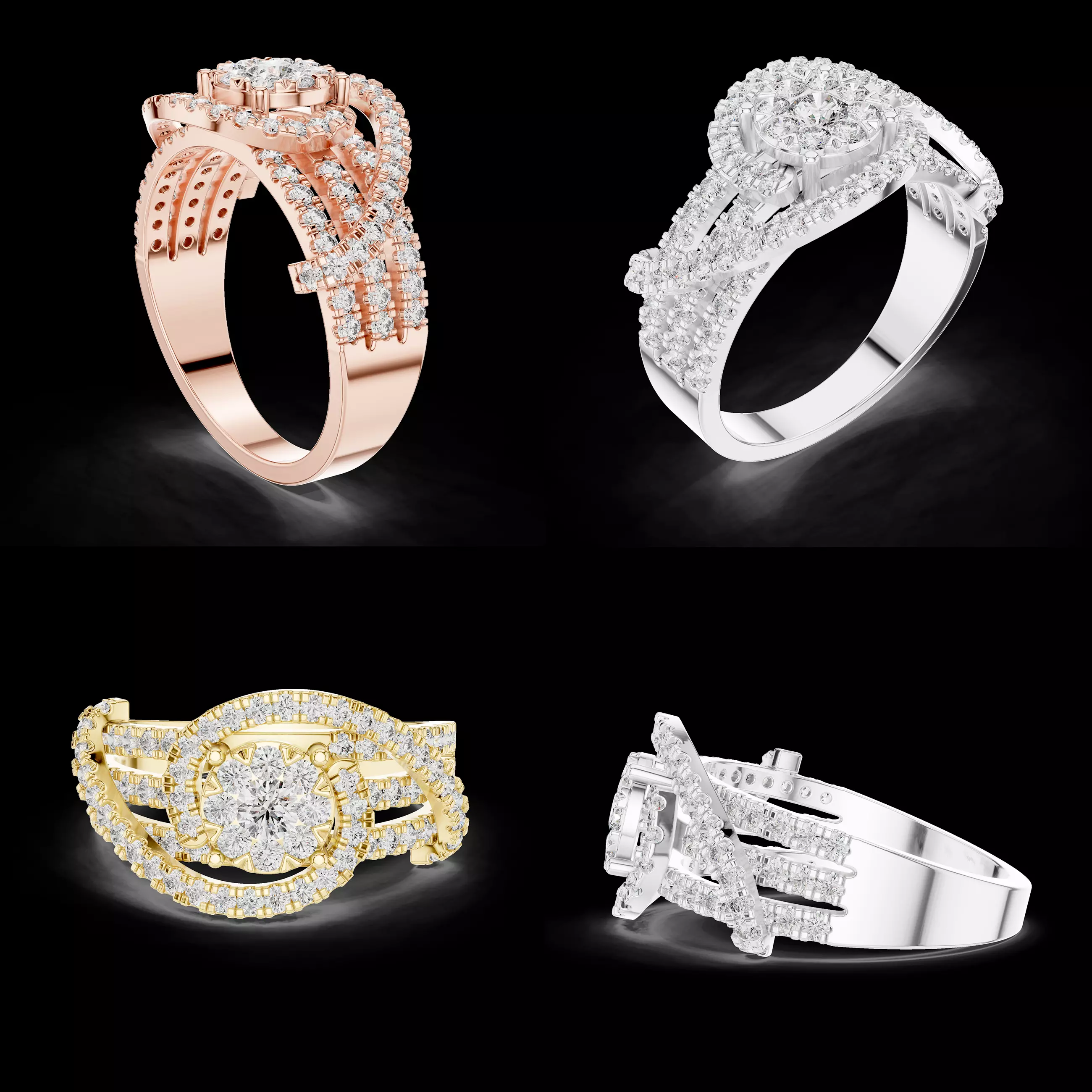 This luxury diamond halo split shank ring CAD design features a striking round center cluster enhanced with layered pavé-set split shanks. The flowing crossover structure adds depth, elegance, and a high-end contemporary look while maximizing diamond brilliance from every angle.