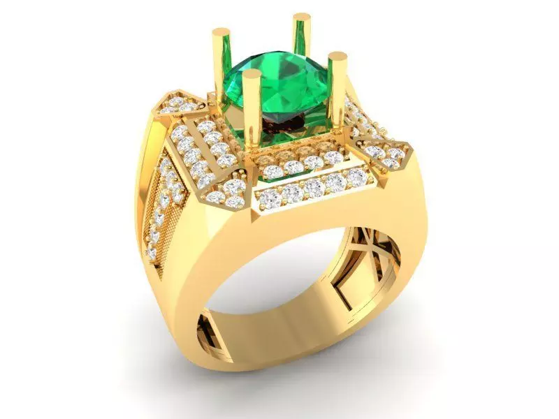 This luxury emerald gemstone men ring 3D model features a bold square structure with a large central gemstone surrounded by multiple accent diamonds.